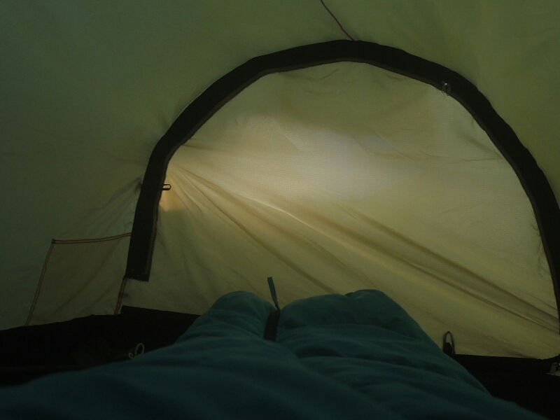 Die Sonne blinzelte durch das Lüftungsloch meines Außenzeltes: Wo bleibt er denn? Ich hatte eine geruhsame Nacht!