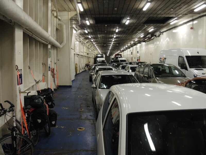 Gut vertäut, aber nicht einsam, verbringen unsere zwei Gefährten die Überfahrt im riesigen Schiffsbauch.