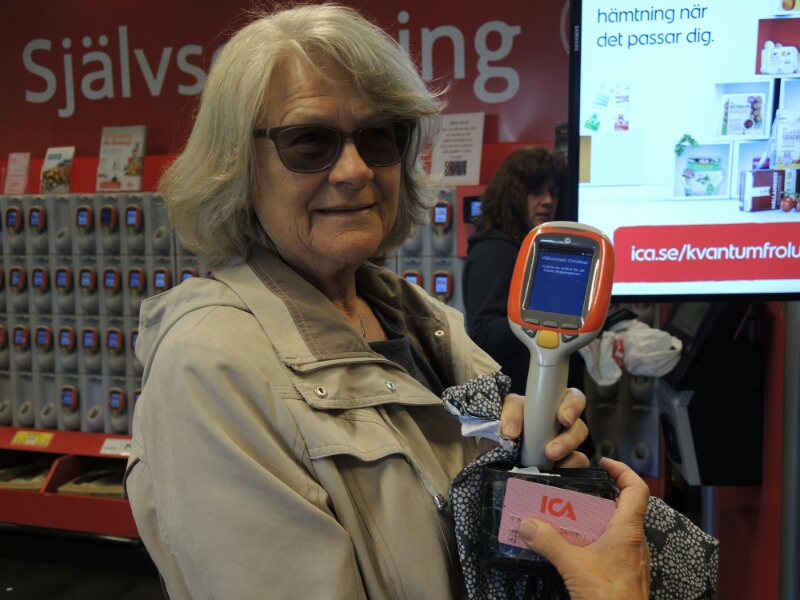 Christina hat es mir dann freundlicherweise erklärt: Die Plastikkarte ist das Bezahlsystem, das mit dem Handscanner verbunden wird. Die Waren werden gleich bei der Entnahme aus den Regalen selbst gescannt. Am Ende wird das Gerät wieder zurückgestellt. Das wars dann. Christina schätzt das System sehr.