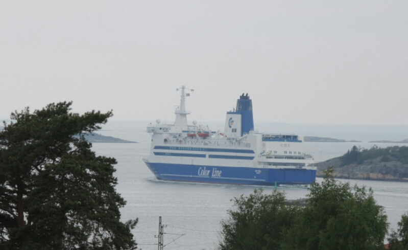 …mit Blick auf die auslaufende Fähre von Strömstad in Schweden über den Eingang zum Oslofjord nach Sandefjord in Norwegen.