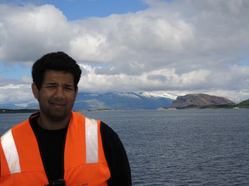Marco ist auf der Fähre von Forvik nach Tjotta für den Ticketverkauf zuständig. Ein Arbeitsplatz mit grandiosem Ausblick. Die knapp  einstündige Fährfahrt zählt für mich zu den schönsten Verbindungen überhaupt.