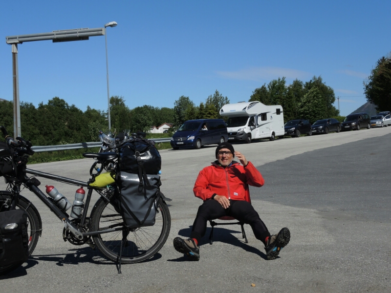 In meinem Super-Sessel habe ich die Wartezeit auf die Fähre von Levang nach Nesna für ein Sonnenbad genutzt und entspannt. Heute werden es 20 Stunden Sonnenschein.