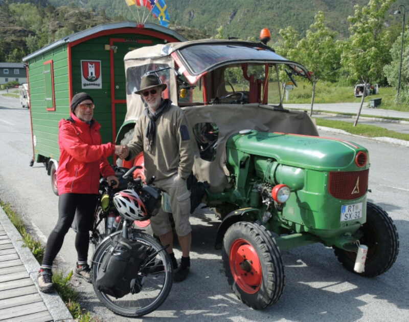Auch Claus mit seinem 50 Jahre alten Trecker Charly wartet auf die Fähre, die uns gemeinsam über den Polarkreis bringt. Sie sind in Baden-Württemberg gestartet und wollen wohin wohl? Klar, zum Nordkap. 100 km legen sie täglich zurück.