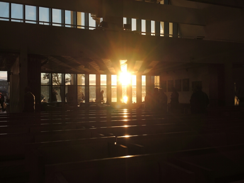23:11 Durch die geniale Konstruktion können die Sonnenstrahlen stets den Innenraum erreichen. Die  Mitternachtssonne streift wärmend den Altarraum.