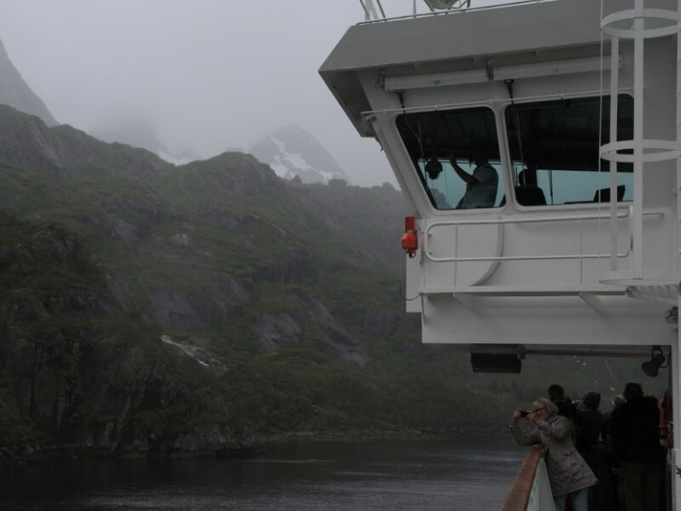 Kapitän Roar Winther winkt euch noch einmal zu, bevor er die Drehung des Schiffes, quasi um die eigene Eichse, an einer geeigneten Stelle einleitet. Anders wären wir aus dieser Sackgasse nicht wieder herausgekommen.