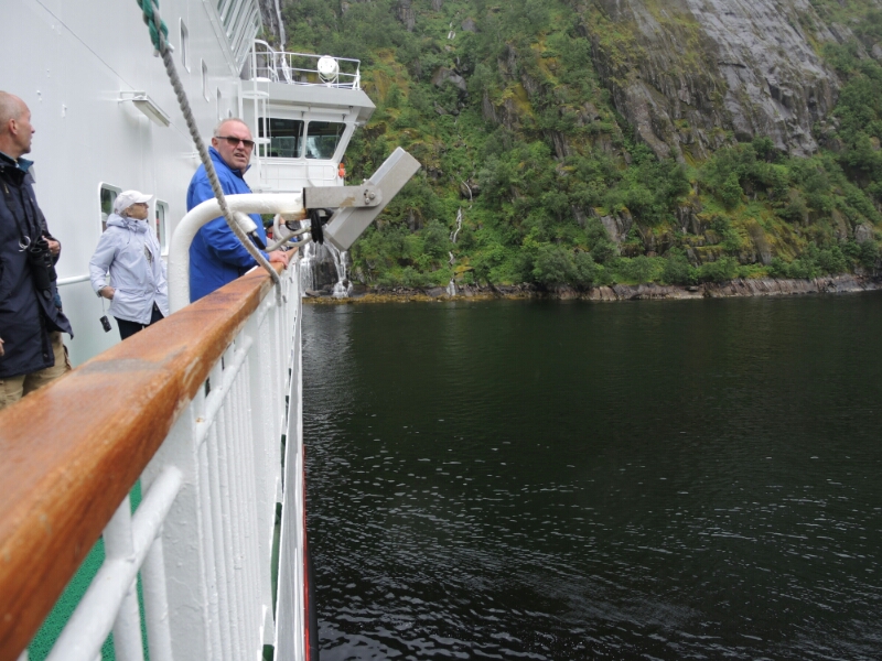 Kapitän Roar Winther winkt euch noch einmal zu, bevor er die Drehung des Schiffes, quasi um die eigene Eichse, an einer geeigneten Stelle einleitet. Anders wären wir aus dieser Sackgasse nicht wieder herausgekommen.
