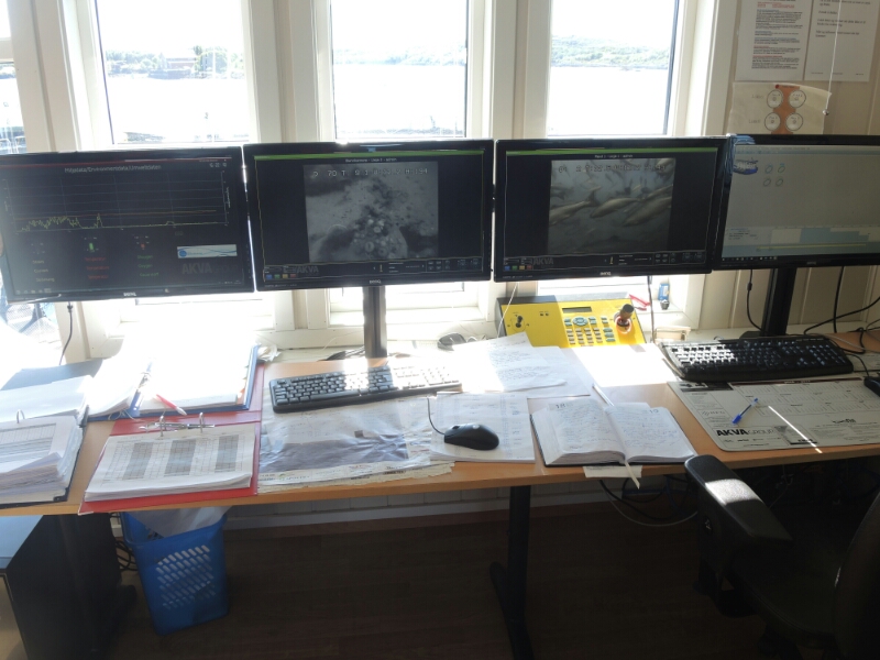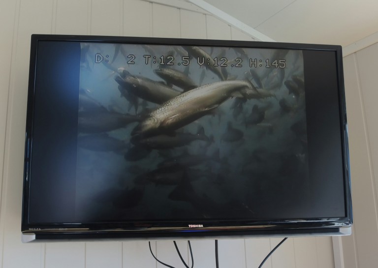 Die Unterwasserkameras erfassen, ob Futter bis in die Tiefe durchfällt. Ist dies der Fall, stellen die automatischen Pelletwurfanlagen die Fütterung ein. Die Lachse sind offensichtlich satt.