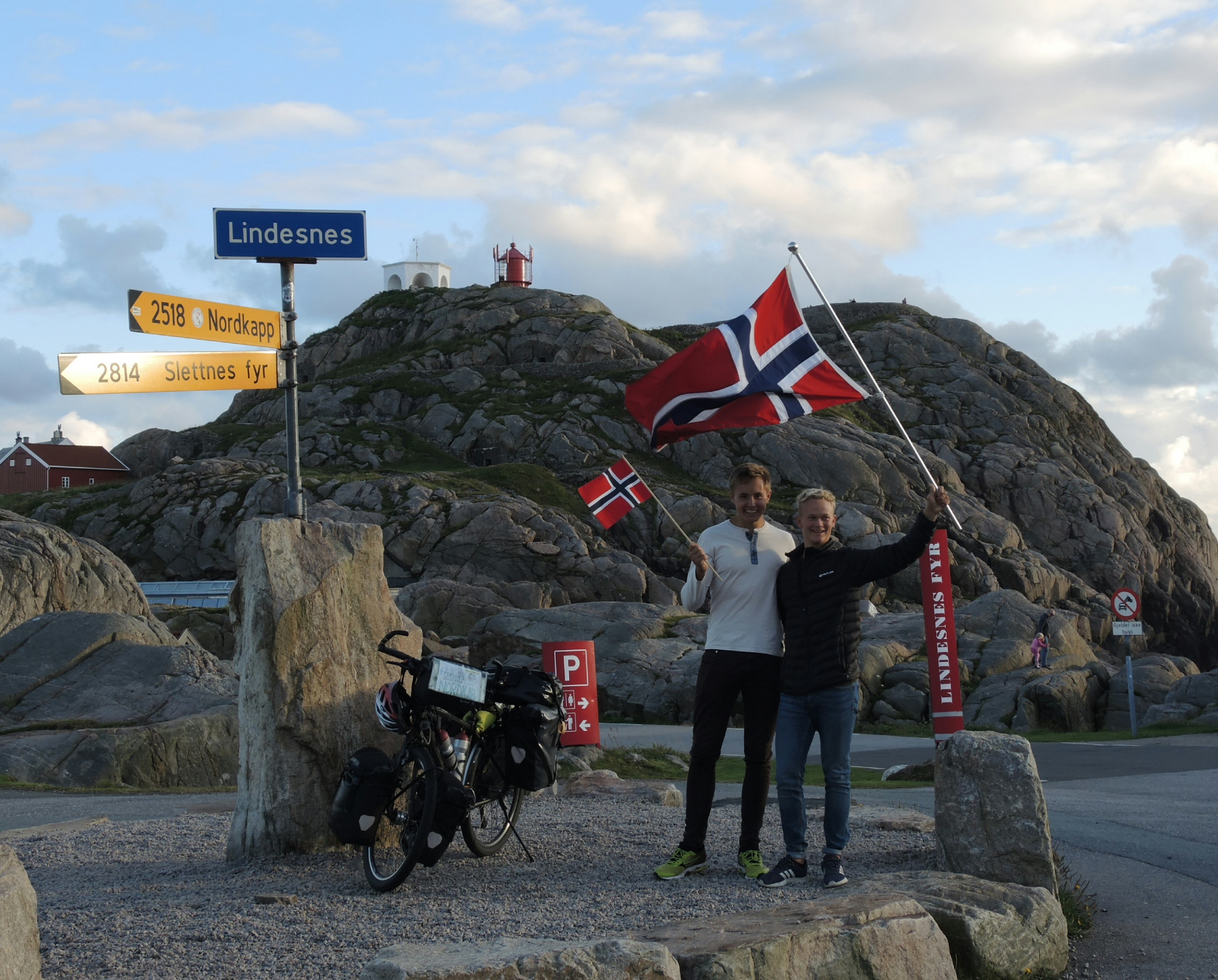 Tom und Inge, in Norwegen ein Männername, hatten gestern Abend zwei Freundinnen begrüßt, die vom Nordkap zum Südkap geradelt waren. Die Luftlinienentfernung steht auf dem Schild, mit dem Fahrrad benötigten sie 3.500 km. Sie alle wohnen hier in Lindesnes.