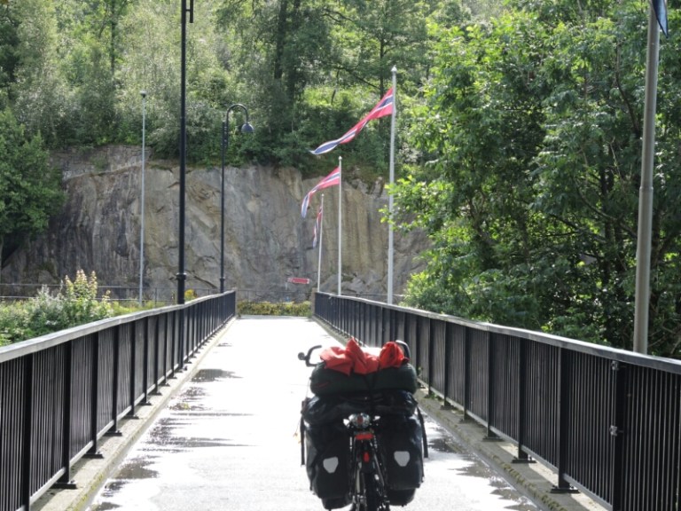 Die Fahrradbrücke in Vigeland mit Fahnenspalier.