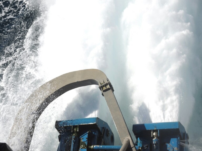 Die Antriebsaggregate der Katamaran-Autofähre peitschen das Meer auf. In nur 2:15 war die Strecke geschafft.