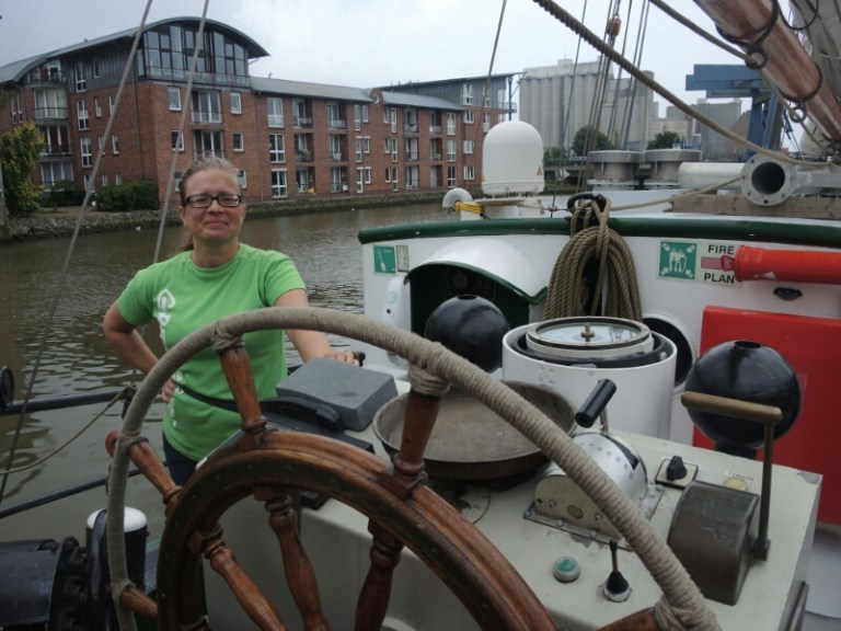 Kathrin, sie hat mit mir eine Führung durch die Beluga II gemacht. Eine Woche hat sie sich frei genommen, um Greenpeace zu unterstützen. Auf See war sie auch schon und musste sich in der Koje festschnallen, so schwer war die See.