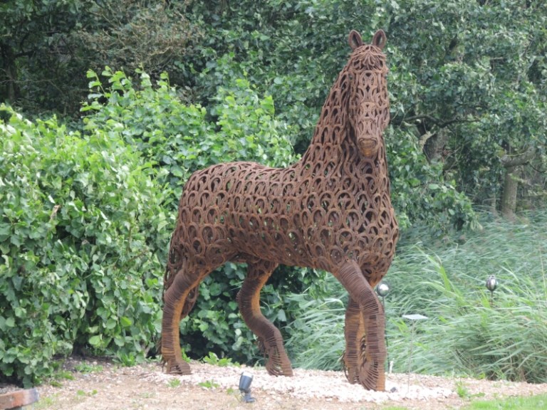 Unterwegs nach Büsum: Ein lebensgroßes Pferd nur aus Hufeisen zusammengeschweißt.
