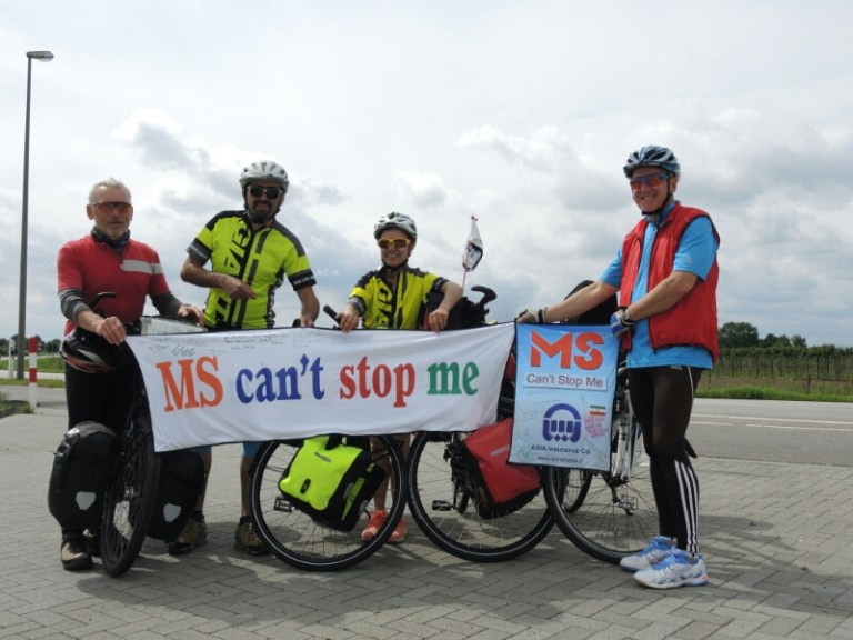 Das iranische Ehepaar Behnaz und Ali ist seit 45 Tagen in Europa mit dem Fahrrad unterwegs. Sie hofft dadurch ihre MS-Erkrankung zu besiegen. Geheiratet haben die beiden in 5.671 m Höhe auf dem höchsten Berg Irans. Auf dem Banner ist jetzt auch ein guter Wunsch von ludwigontour.