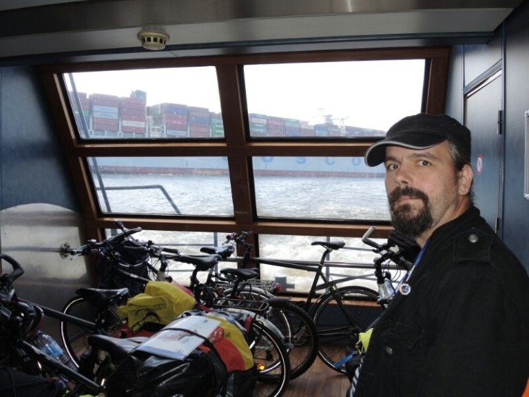 Auf der Fähre hatte ich ‚Wache‘ für die vier Fahrräder geschoben. Lars war ein interessanter Gesprächspartner. Er hat als Offizier auf Handelsschiffen die Weltmeere bereist und ist jetzt bei der christlichen Seemannsmission in Hamburg, aber auch schon in Port Said in Ägypten, tätig. Tgl. nehmen mehr als 100 Seeleute aus aller Herren Länder die Dienste in Anspruch.