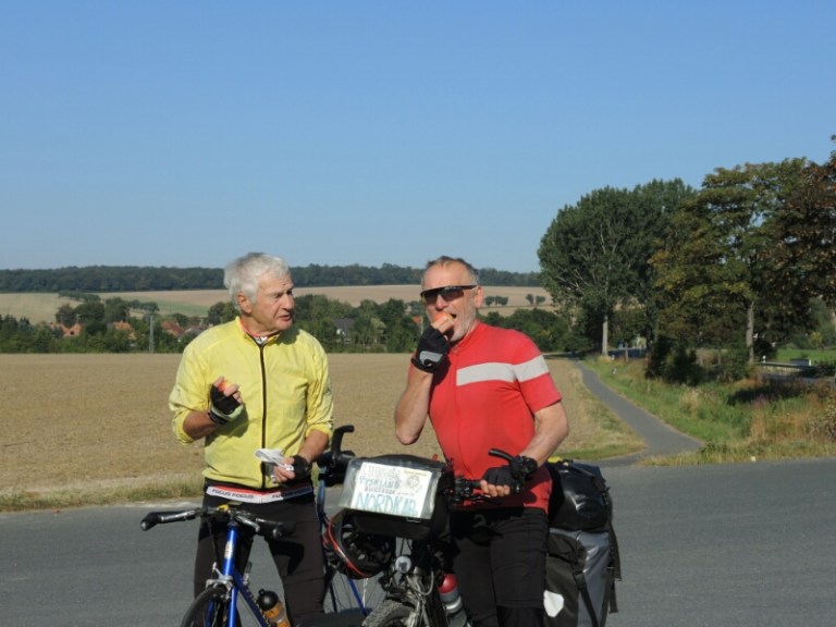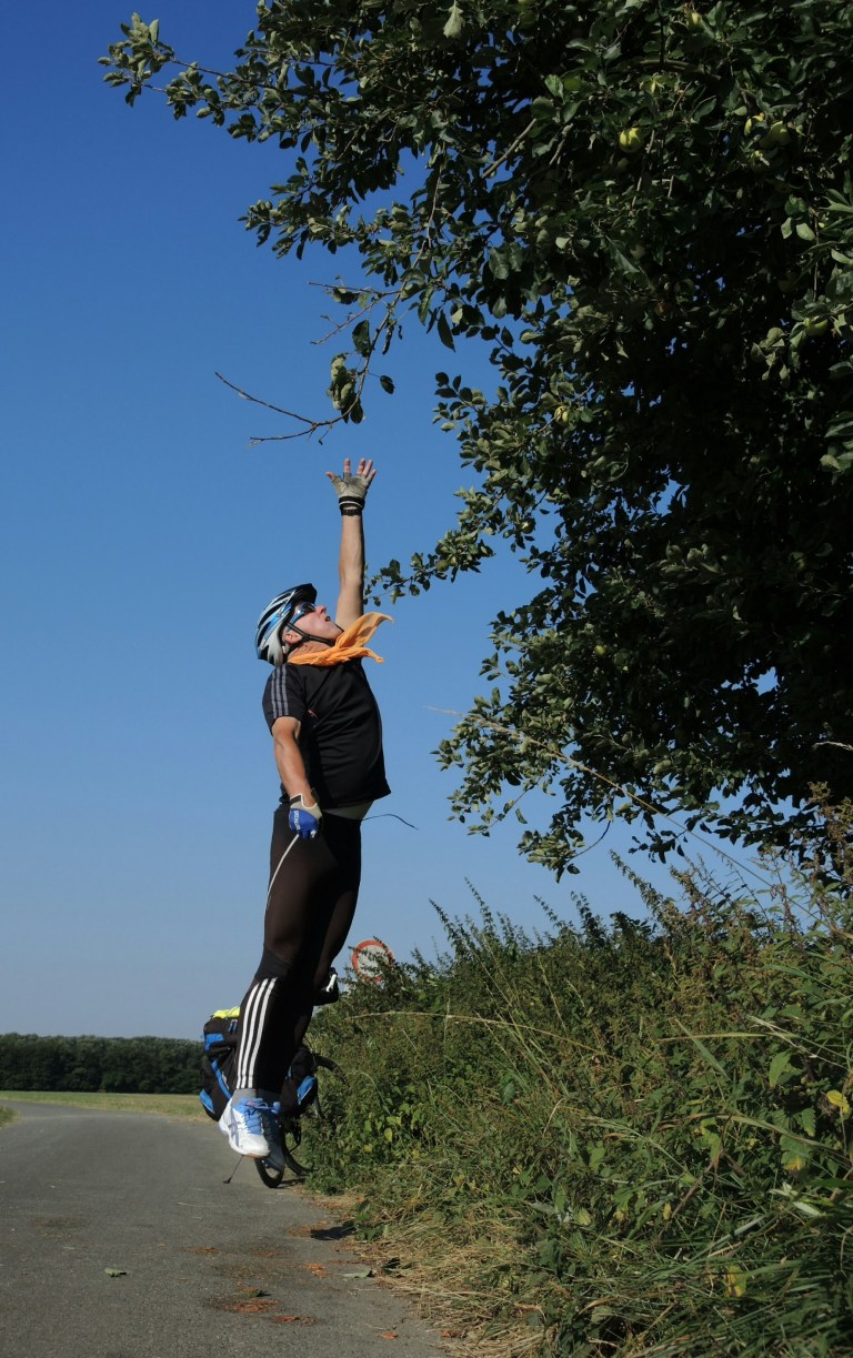 Mit Herbert habe ich eine Apfelpause gemacht. Er ist 80 Jahre alt, fährt immer noch täglich bis zu 80 km mit seinem Rennrad und war 1980 per Fahrrad am Nordkap.
