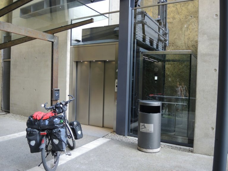 …ganz bequem mit dem Fahrstuhl nach oben in die Stadt befördern lassen.