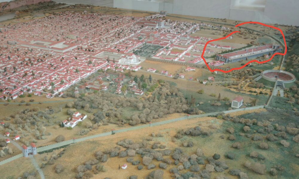 Gleich daneben befand sich die damalige ‚Formel 1 – Rennstrecke‘ mit Platz für 25.000 Fans (rot markiert). Die roten, blauen, grünen und gelben Rennställe sind mit ihren vierspännigen Pferdewagen gegeneinander angetreten. Damals wie heute war viel Geld zu verdienen, hoher Status zu erwerben und alles extrem risikoreich.