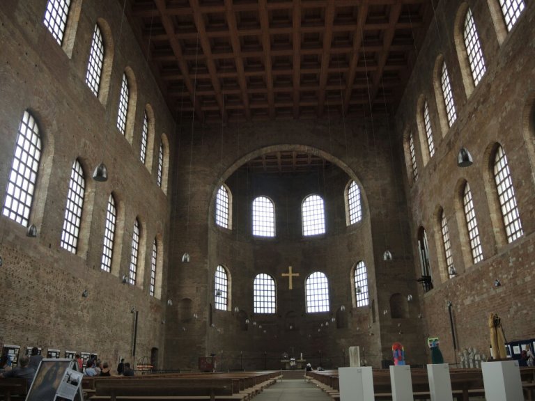 Konstantin-Basilika. Sie war mal die Festhalle Römischer Kaiser. 71 m lang, 32m breit und 33m hoch. Heute eine evangelische Kirche.