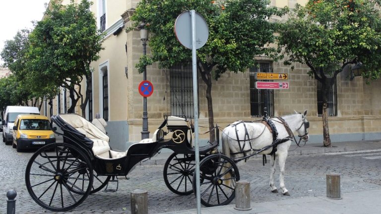 Ganz klar, ich bin in Andalusien: Pferdeland. Mein Gefährt vor der Alcasar de Jerez.