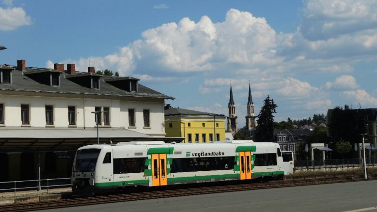 In Oelsnitz fährt gerade die Vogtlandbahn ein.