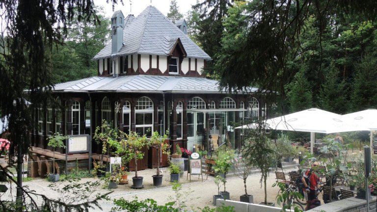 Die letzte Pause: ‚Waldquelle‘, Restaurant und Freilichtbühne kurz vor Bad Elster . Kaum angekommen kam der einzige Regenschauer des Tages: Glück gehabt.