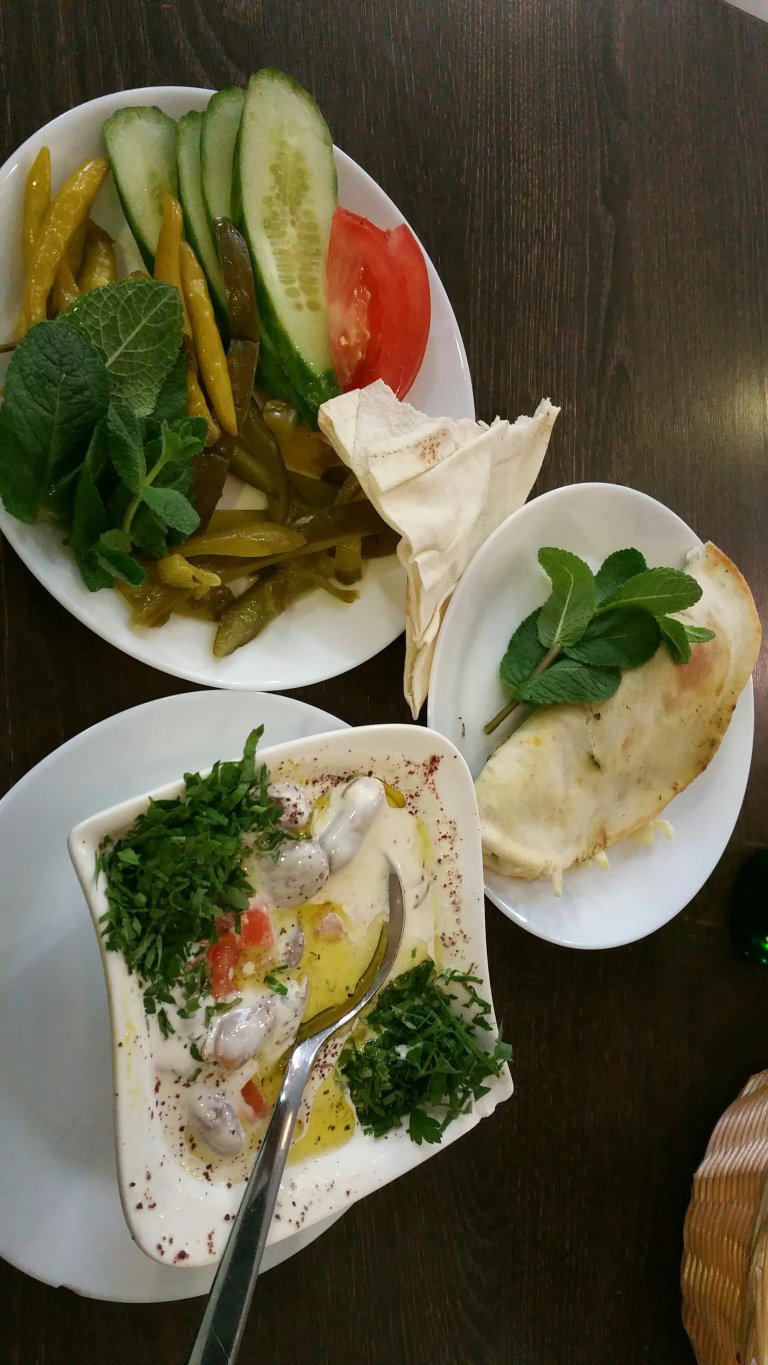 Arabisches Abendessen ganz in der Nähe im Hum Yum: Vorspeise, Hauptgang Bohnen in Joghurt (warm, sehr lecker), kleiner Salat und nicht im Bild Halawa (süße Nachspeise). Einschließlich Getränk alles zusammen für 10,50 €.