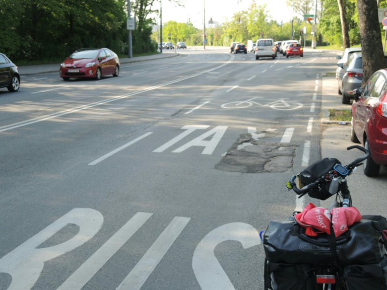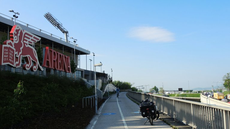 Auf Radwegen bequem heraus aus Wien. Hier neben dem Stadion des FC Austria Wien donnert der Straßenverkehr eine Etage tiefer sechsspurig vorbei.
