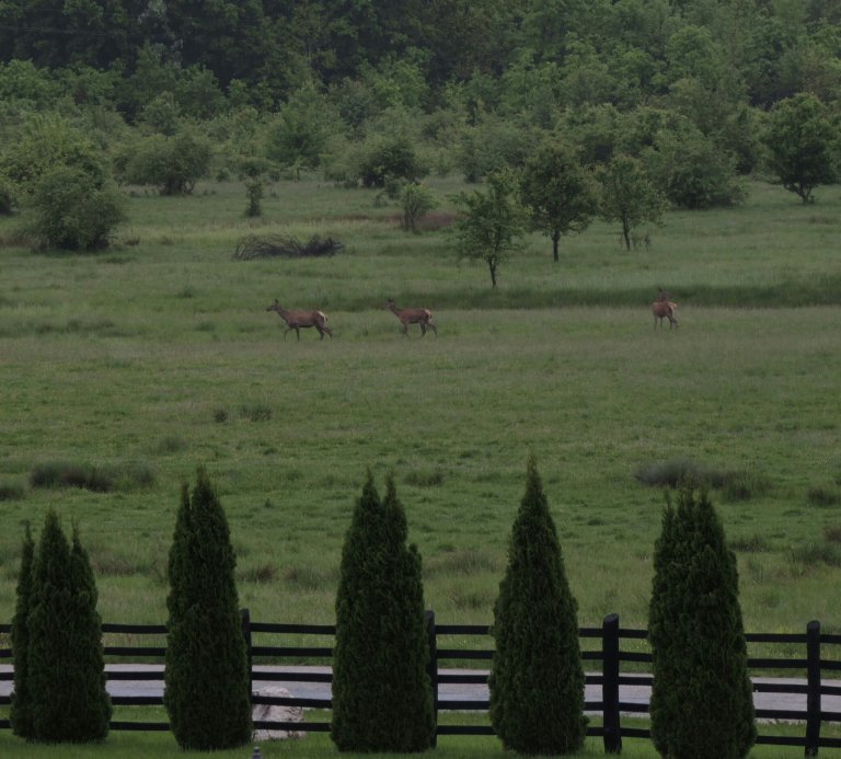 Vom Frühstückstisch beobachtet: Drei Hirsche ziehen gemächlich vorbei. Erst kurz vor 10.00 Uhr hört es auf wie aus Eimern zu schütten, dann erst fahre ich los.