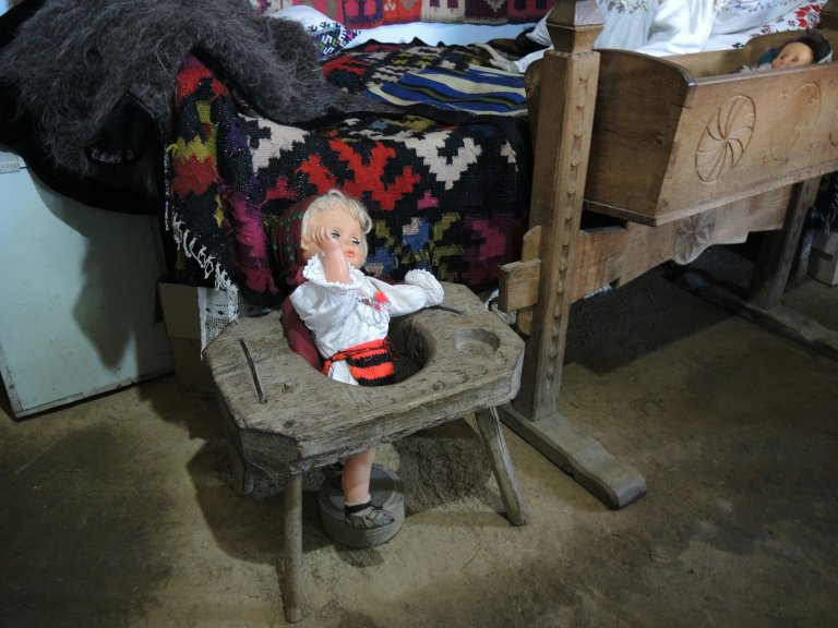 Der Aufbewahrungsschemel für Kleinkinder, wenn die Mutter z.B. melkt oder spinnt.