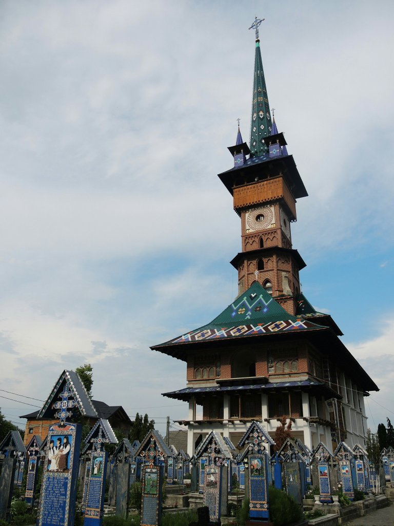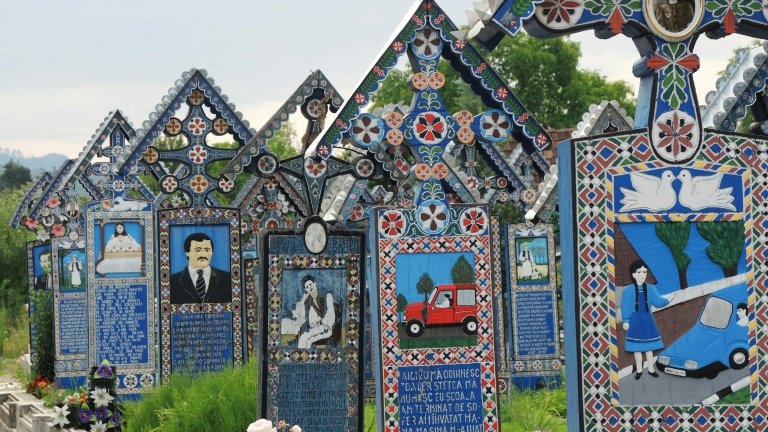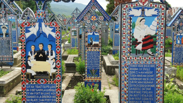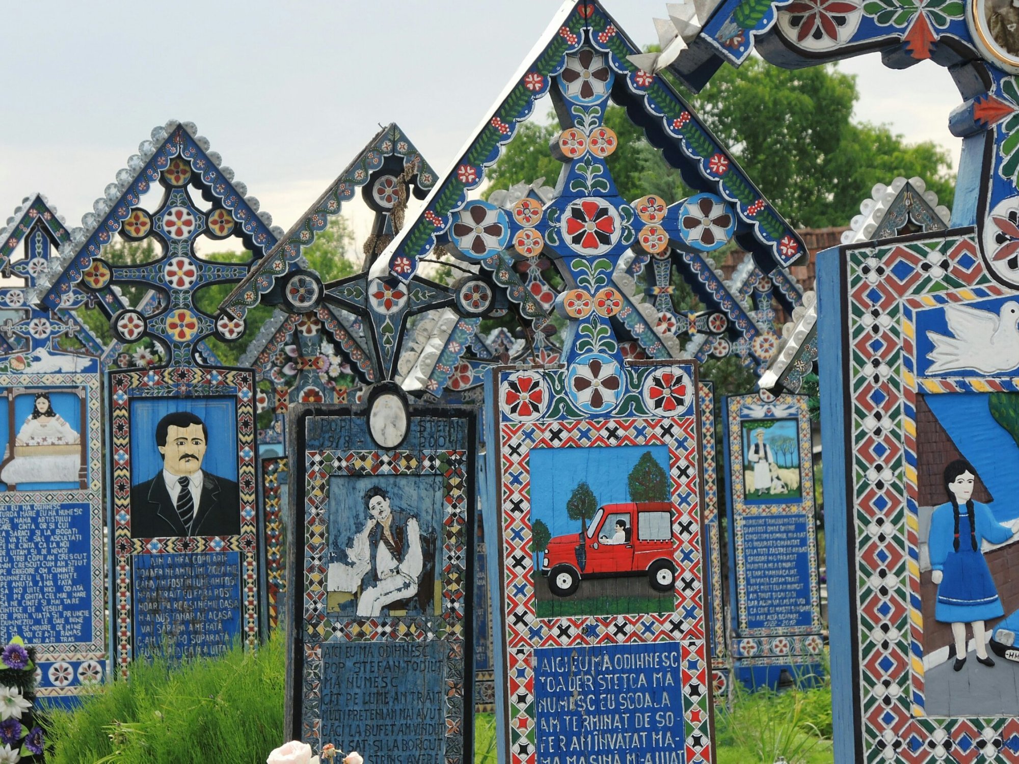 Die Gestaltung erfolgte über Jahrzehnte durch den örtlichen Künstler Stan Ioan Pătraș (1908–1977). Er hat die traditionellen hölzernen Grabstelen mit handgemalten Bildern der Verstorbenen und mit Versen zu ihrem Leben verziert. Mehr auf Wikipedia