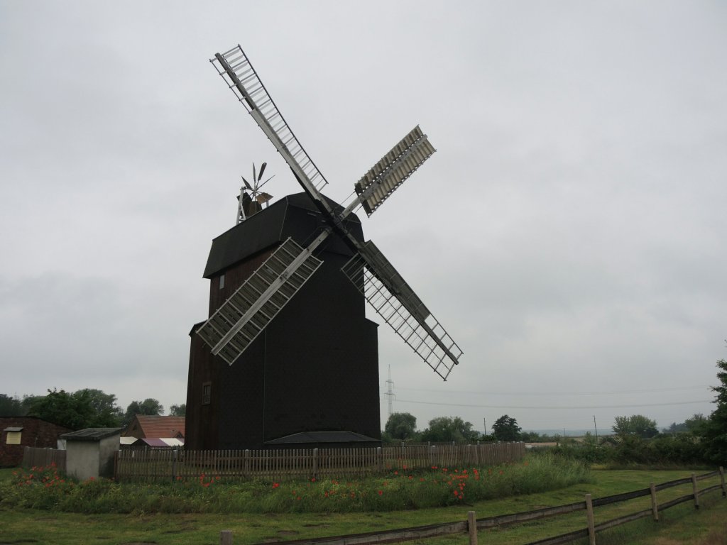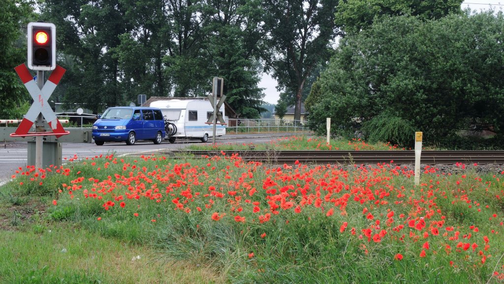 In Burg ist noch heute, so erfahre ich, der größte Militärstandort Deutschlands.Selbst am Bahnübergang leuchtet die Natur schon früh am Sonntagmorgen.Im UNESCO- Welterbe – Biospährenreservat.Die Elbe darf sich hier bei Hochwasser noch entfalten. Der Weg häufig auf der Deichkrone.Auf der Bank steht geschrieben, warum die Wege in so gutem Zustand sind: Dammerhöhung aufgrund des Jahrhunderthochwassers 2013Die Pattrockwindmühle in Parey.