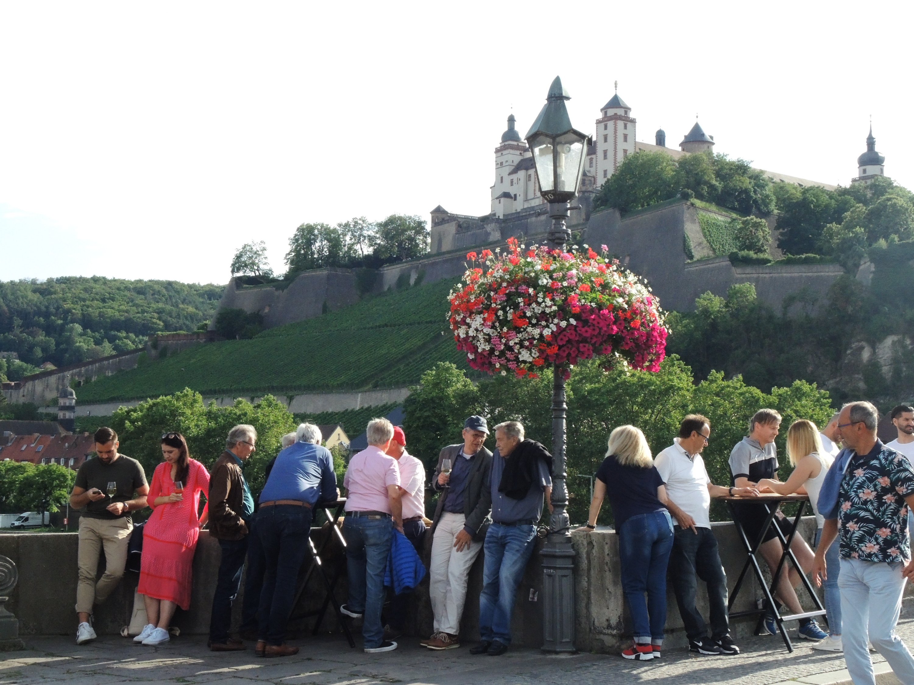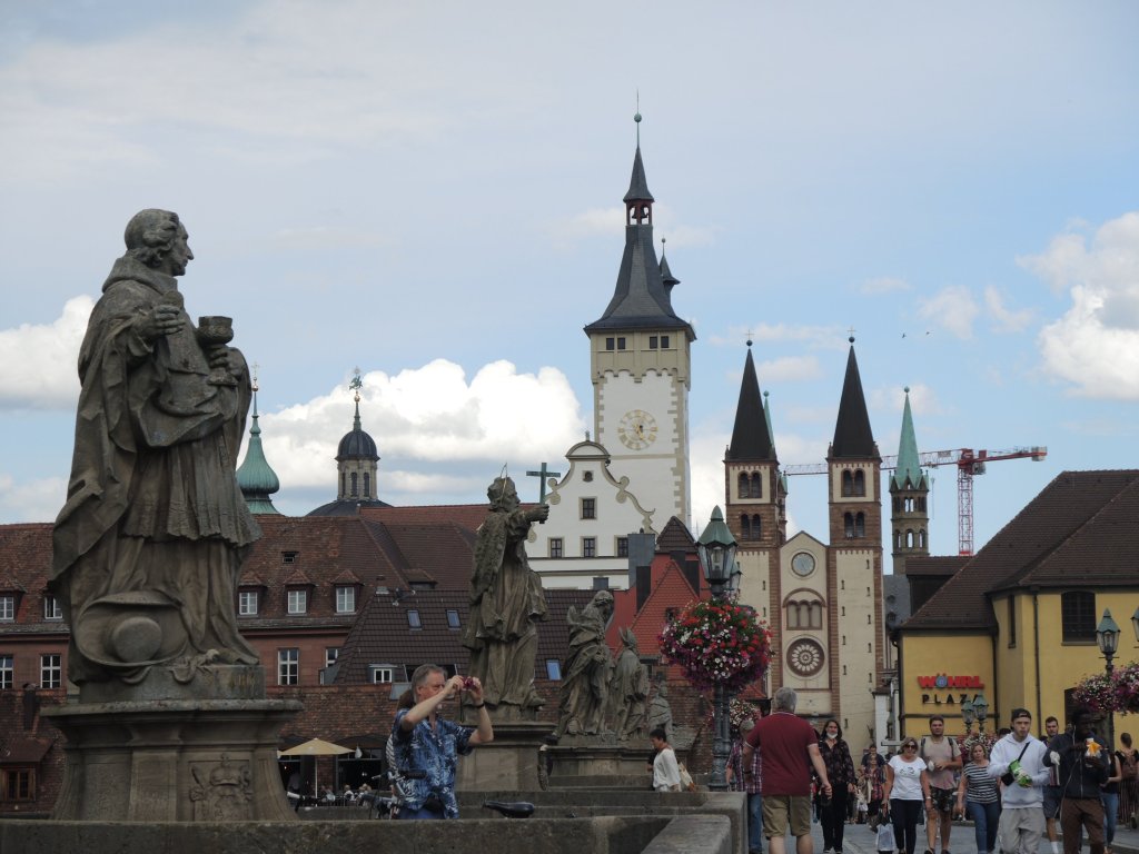 Am Wochende findet das traditionelle Africa Festival statt; das Größte dieser Art in Europa.Die ganze Stadt ist geflaggt.Würzburg glänzt mit seinen barocken Fassaden.Die alte Mainbrücke.Man genießt den Tag mit einem Glas Franken-Wein auf der Brücke. In Vor-Corona-Zeiten wäre zum Sonnenuntergang alles rappelvoll , wurde mir erklärt.