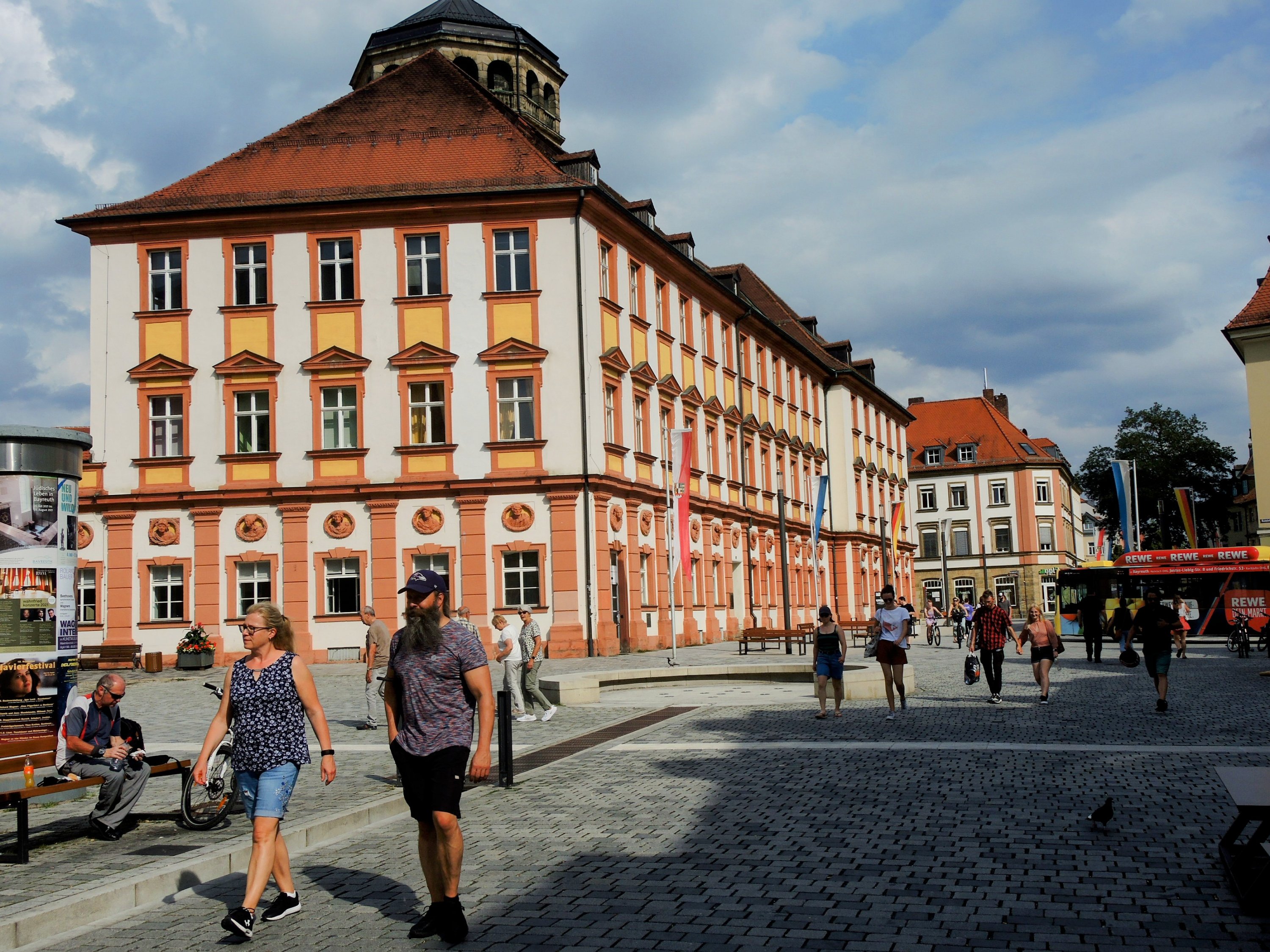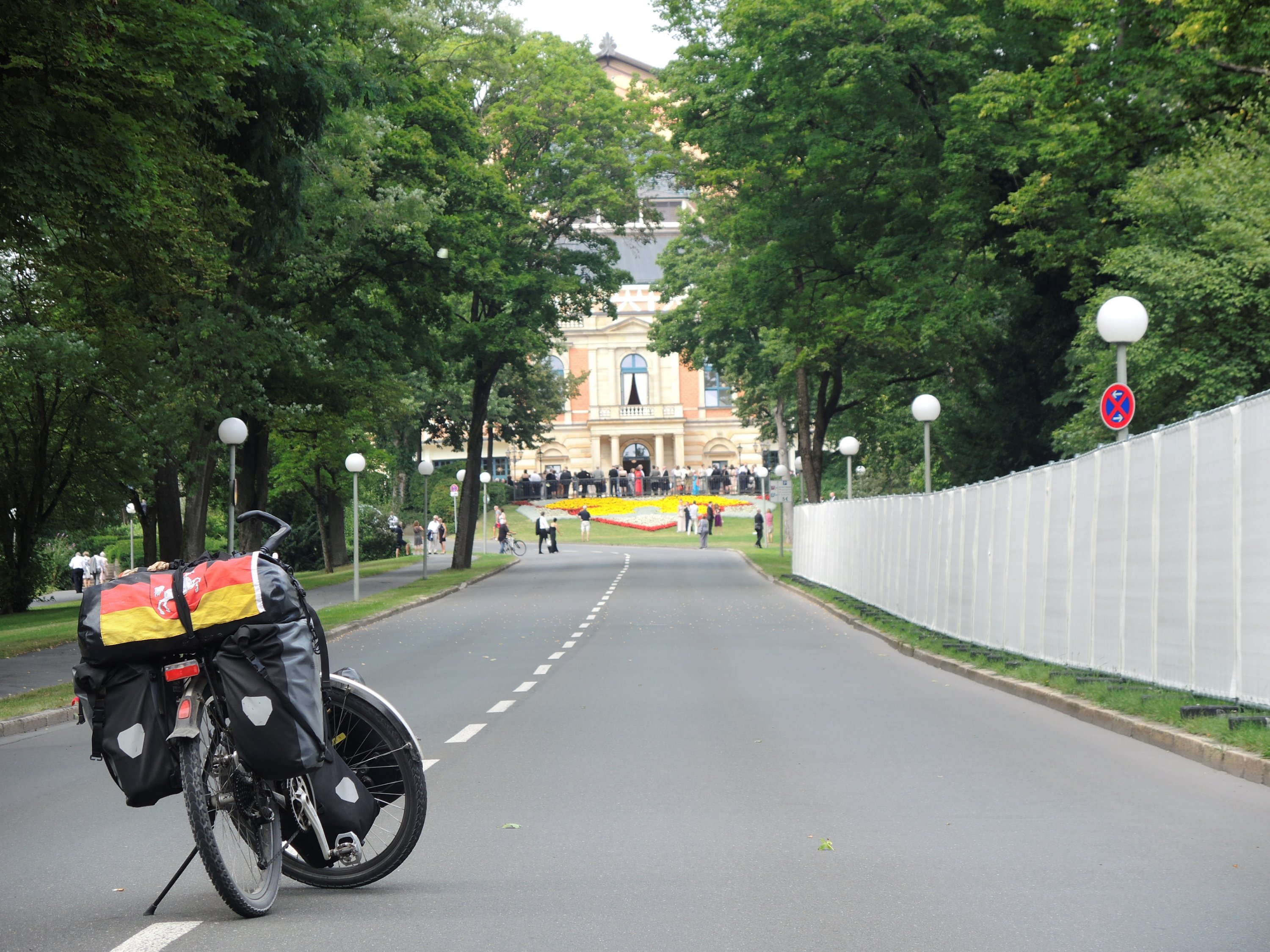 Seit Bamberg ist der Main nicht mehr schiffbar. Es tut ihm gut.Nach 15 km Frühstück bei REWEZunächst flach, aber auch schon ziemlich heiß. Später hoch und runter durch unzählige Dörfer. Auch lange Schotterabschnitte.Die Hochzeit: ‚Weißer Main‘ und ‚Roter Main‘ vereinigen sich bei Kulmbach.Kulmbach meint von sich, die Hauptstadt des Bieres zu sein.Ein Idee wo ich jetzt bin?Nächster Versuch!Angela Merkel und Markus Söder sind diesen Weg zur diesjährigen Eröffnung chauffiert worden; Frank-Walter Steinmeier folgt am kommenden Montag. Zz. nur für Fahrräder frei, aber wer quält sich schon auf den Berg hoch?Pause der heutigen Tannhäuser – Aufführung im Festspielhaus auf dem Festspielhügel.