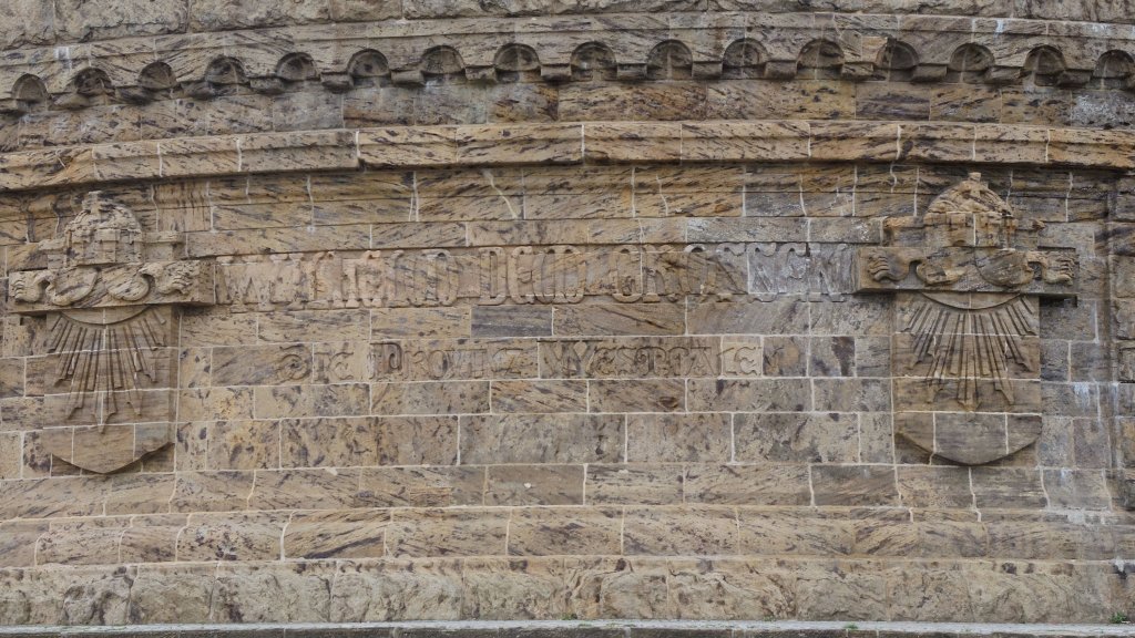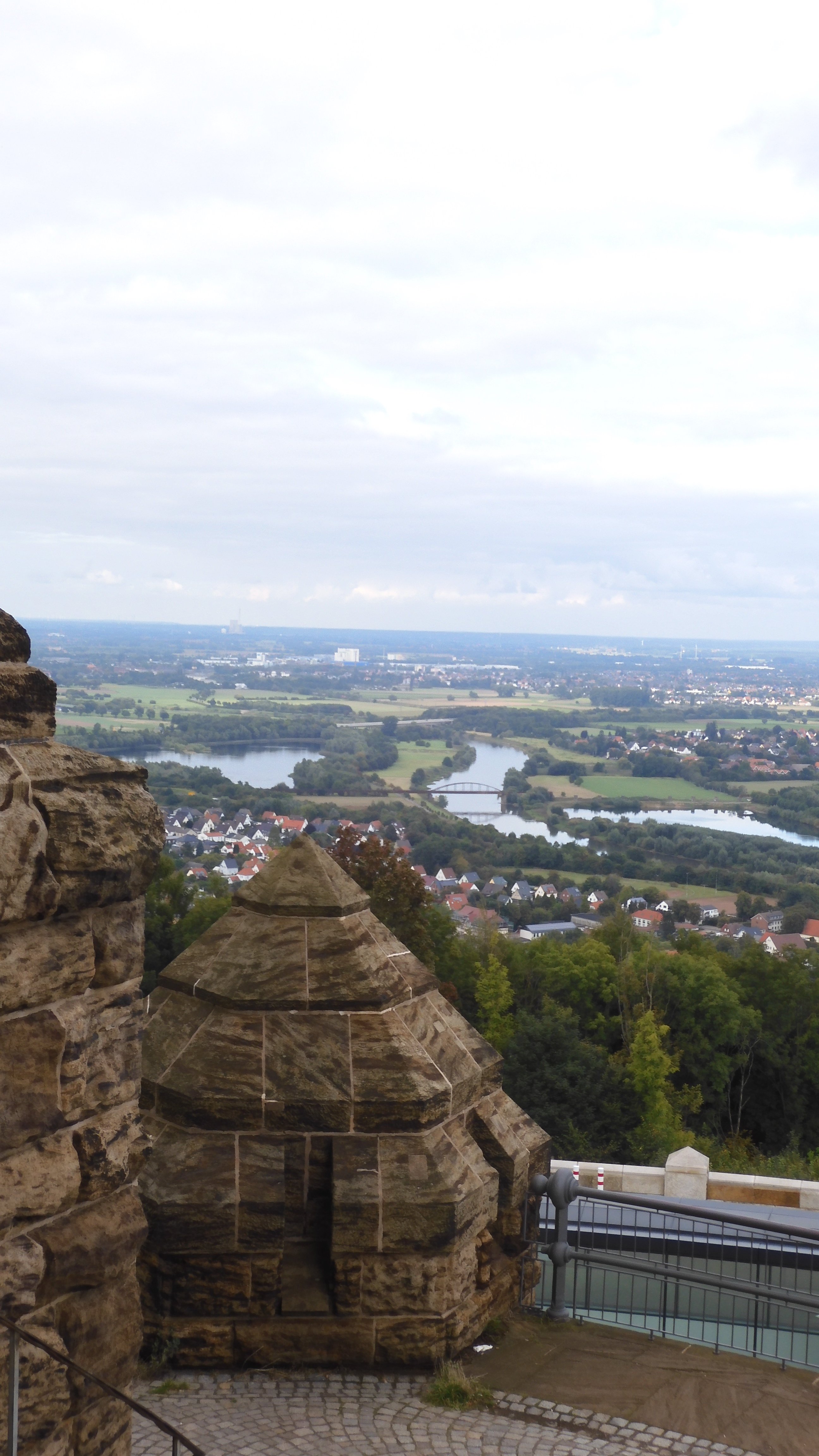 Weserberglands links, Wiehengebirge mit Denkmal rechts. Weser im Vordergrund.