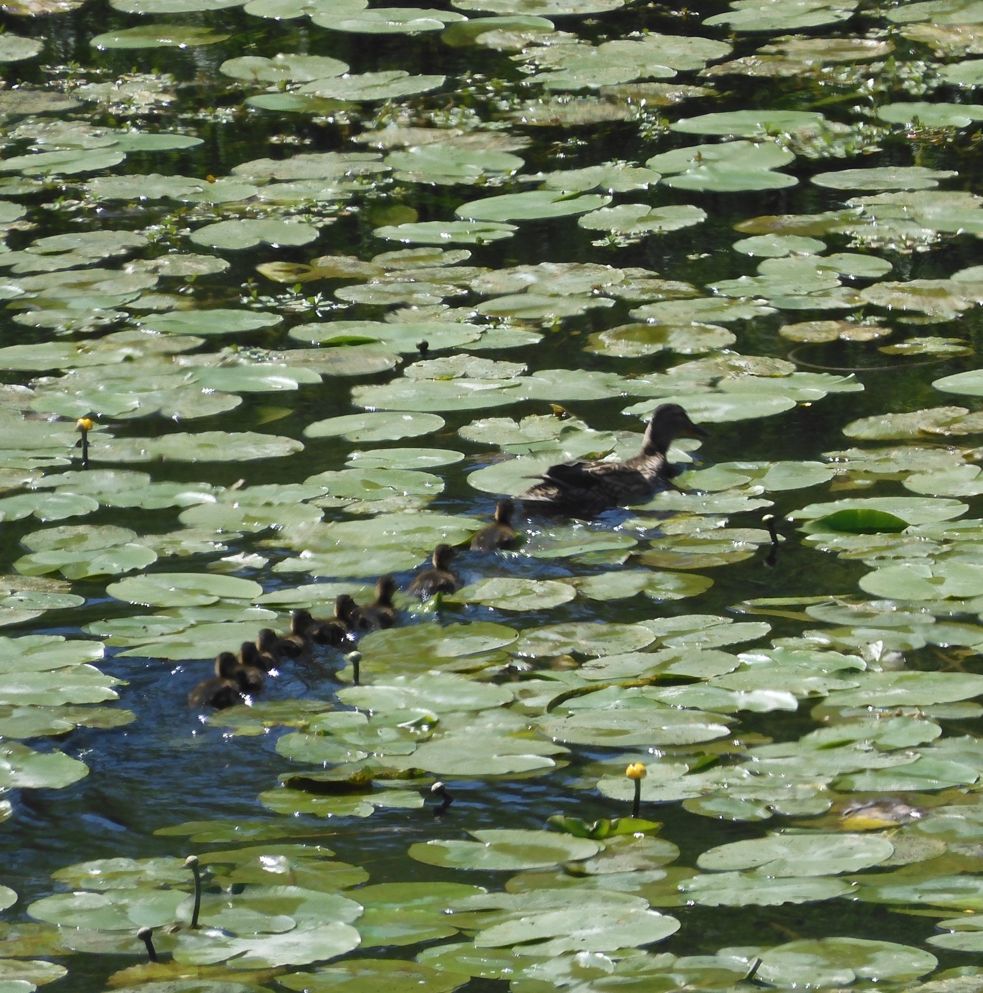 Auch die Entenfamilie ist unterwegs. Was muss es für ein Blütenmeer sein, wenn die Seerosen sich entfalten.