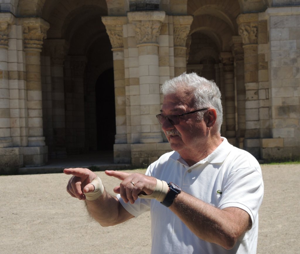Kein Vorbeikommen ohne Käsekauf für Kerstin.Eine historische Eisenbahnbrücke, umgebaut……für Radfahrer.Die Türme der 630 gegründeten Benediktinerabtei in Saint-Benoît-sur-Loire kommen in Sicht.Kerstin und Christian Christian war lange Jahre in Detmold tätig und hat gehört, dass wir Deutsch sprechen. Er schwärmt von den lateinischen Gesängen der Mönche hier.Der Hohe Chor wurde 1.062 errichtet. Während unseres mittäglichen Besuchs spielt ein Orfensbruder auf der riesigen Orgel und wir waren die einzigen Besucher. Ein besonderes Erlebnis.Die Grablege König Philip I.Der Fußboden hat in tausend Jahren seinen Farbglanz nicht verloren.