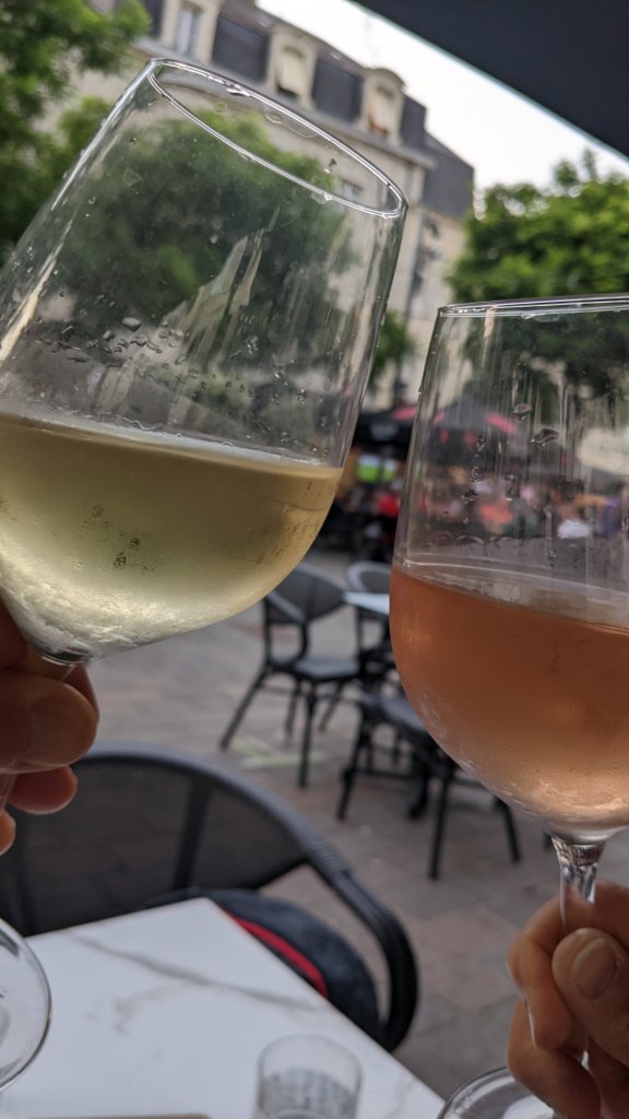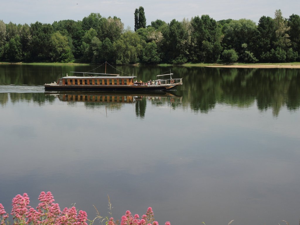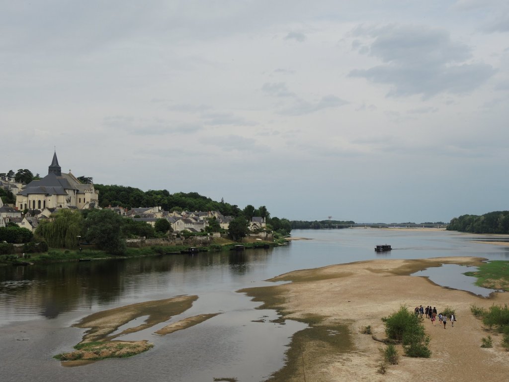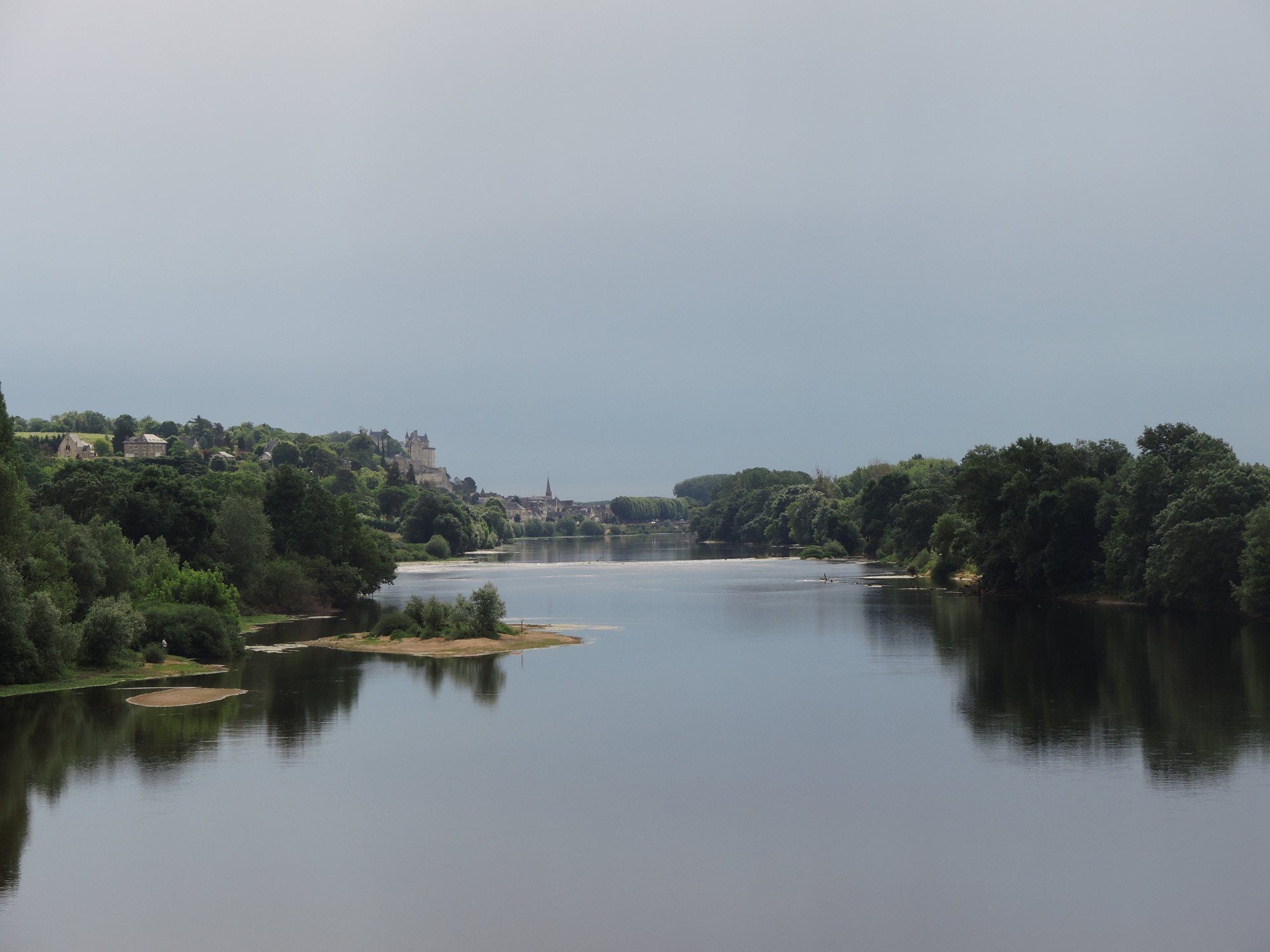 Heute Morgen. Wir überqueren die Vienne und blicken noch einmal auf Chinon zurück.Wein, die Erwartung auf den Tag steigt.Zurück an der Loire. Bei Montsoreau verheiratet sich die Vienne.Der erste Schiffsverkehr, aber nur Ausflugsfahrten.