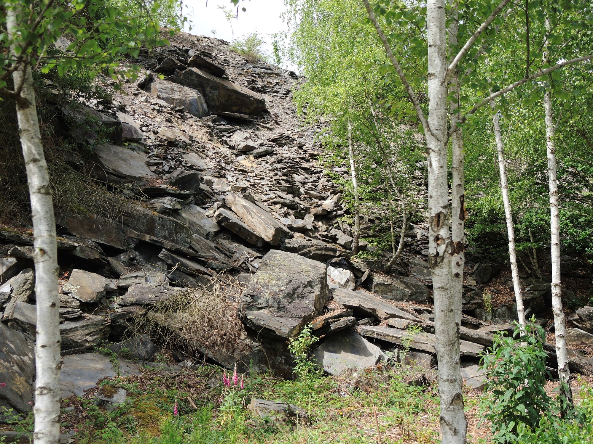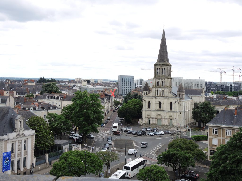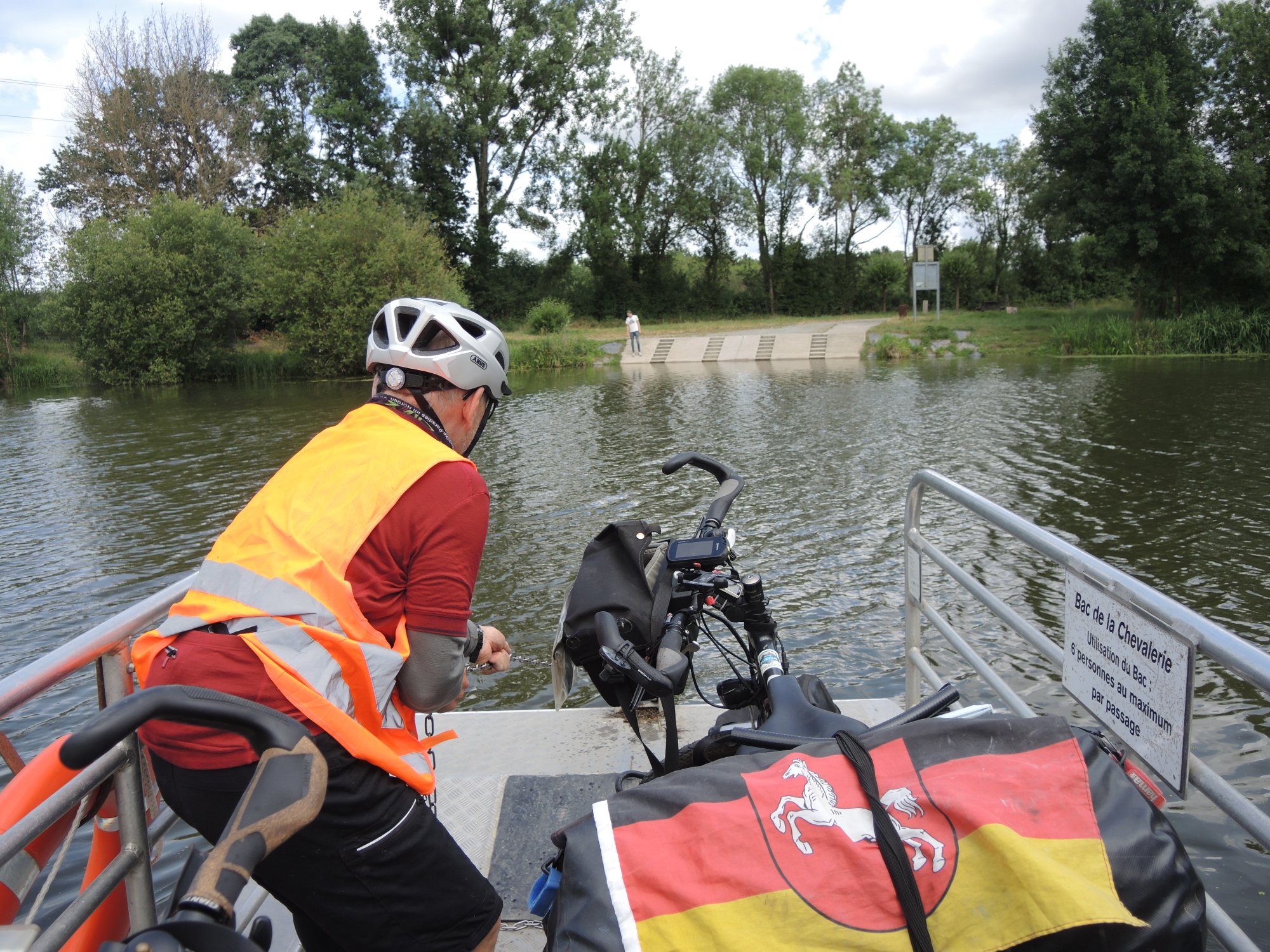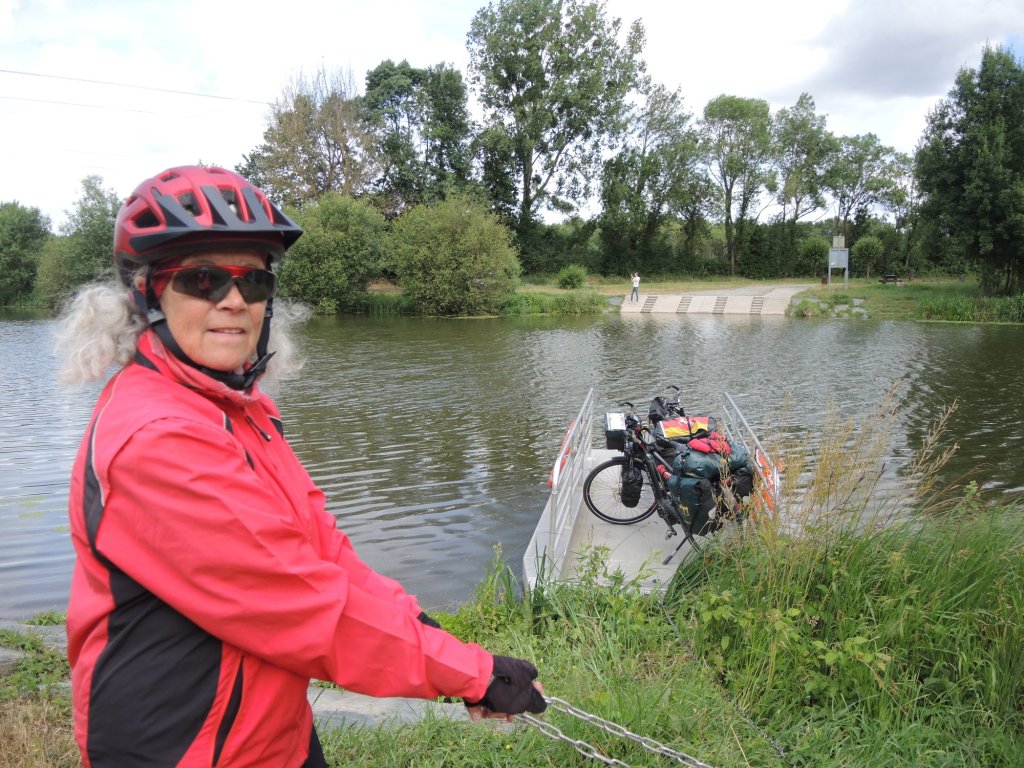 Auf dem Abstecher nach Angers müssen wir mit dieser abenteuerlichen Selbstbedienungsfähre klarkommen.Hol über!Geschafft. Verladen und anlanden waren besonders kritisch.Schiefer, kein Tuffkalkstein mehr.Reste des früheren Tagebaus.Jetzt sind die Bauten auch aus Schiefer.