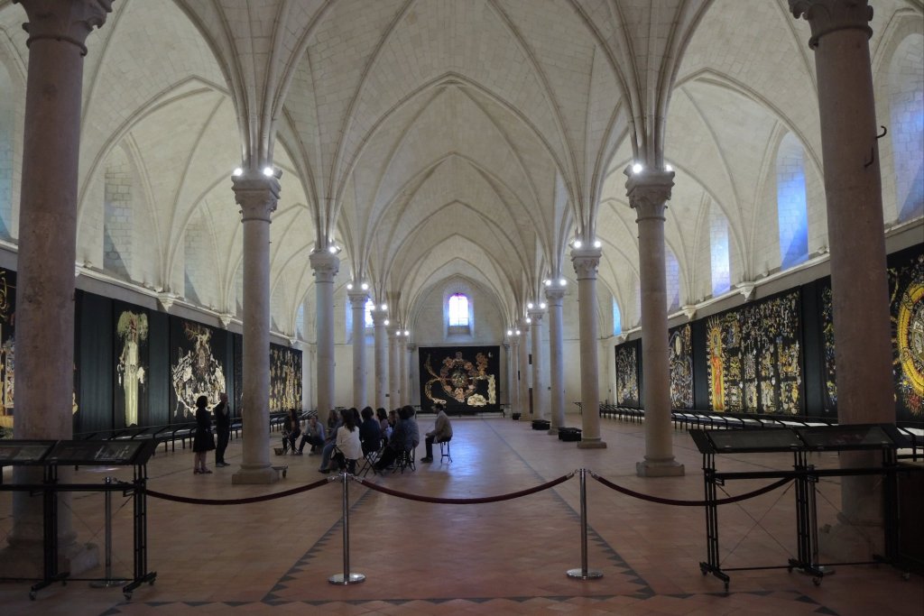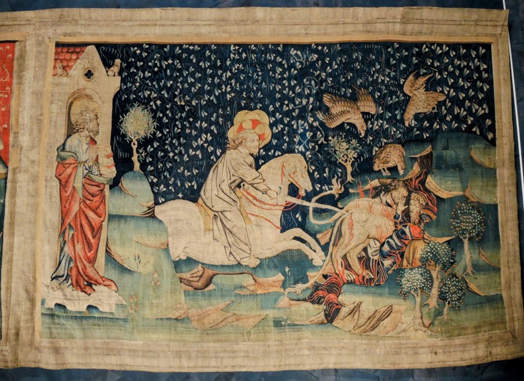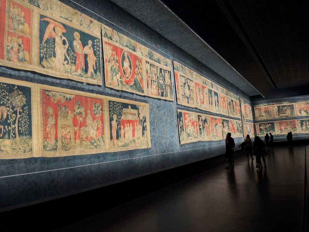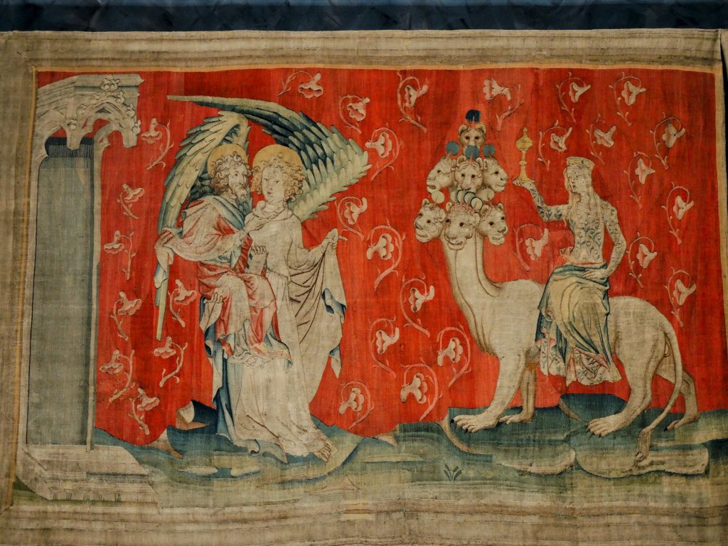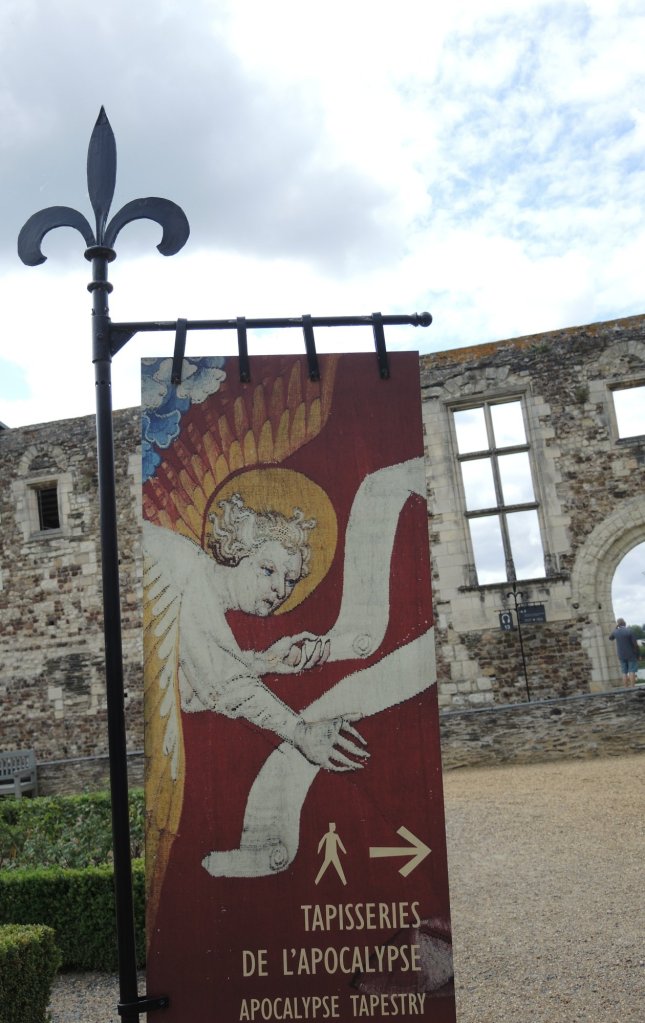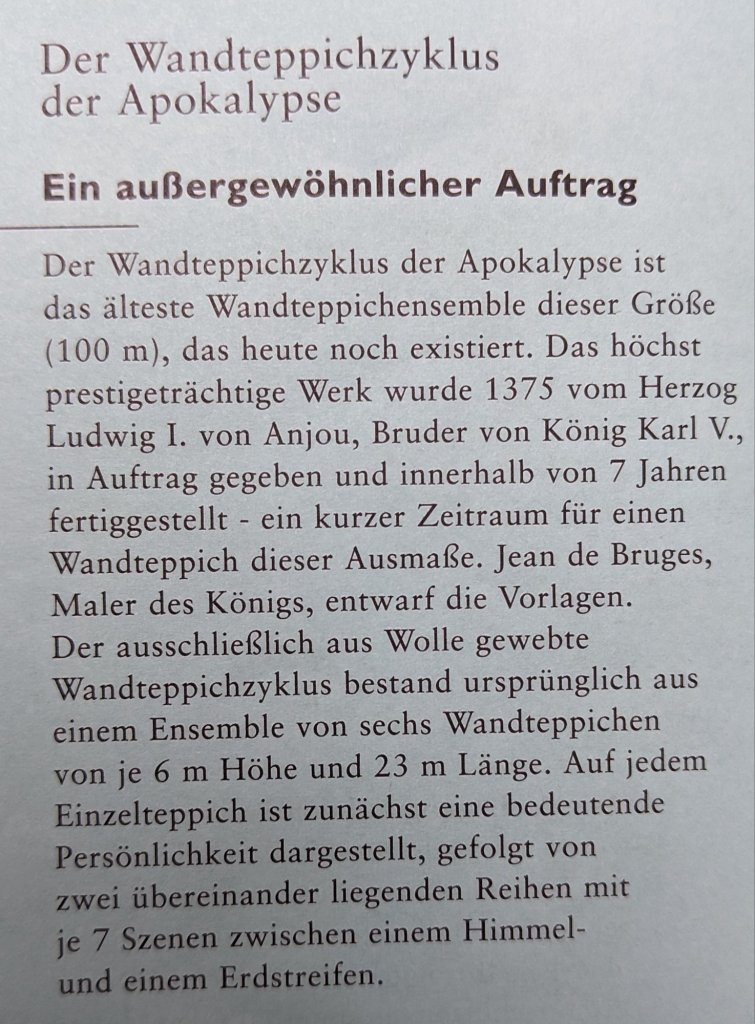 Das war schon mal imposant; der eigentliche Grund, warum wir in dieser Stadt sind, verbirgt sich hinter diesen dicken Burgmauern…….der Wandteppich der Apokalypse.Quelle: Flyer zur Besichtigung100 m lang, 6 m hoch.In der Zeit des Hundertjährigen Krieges entstanden, also 650 Jahre alt.