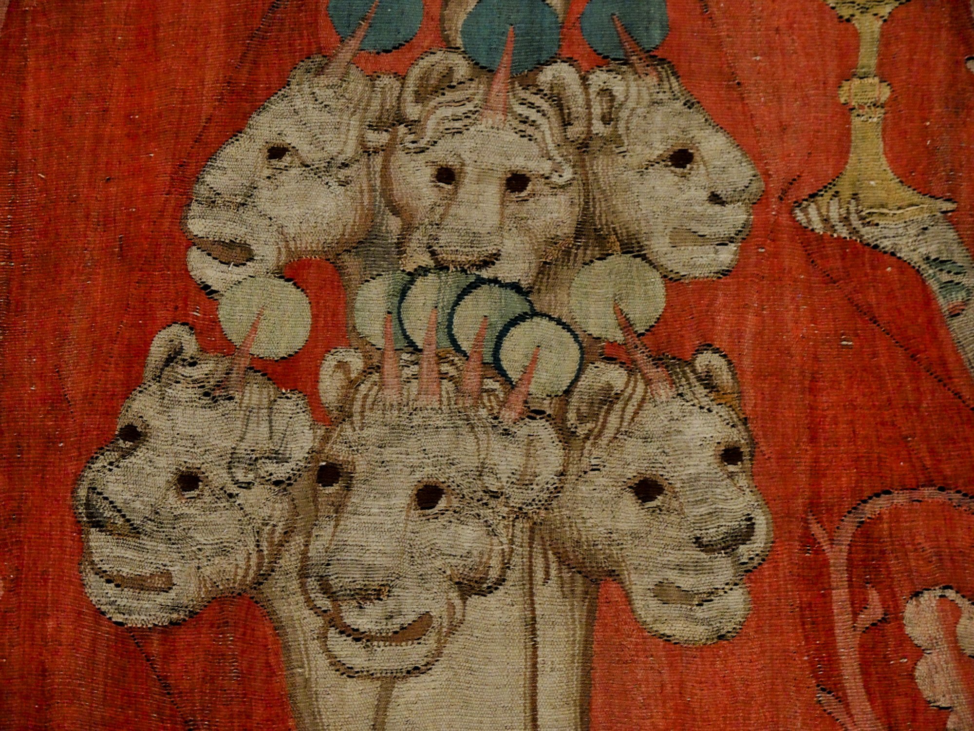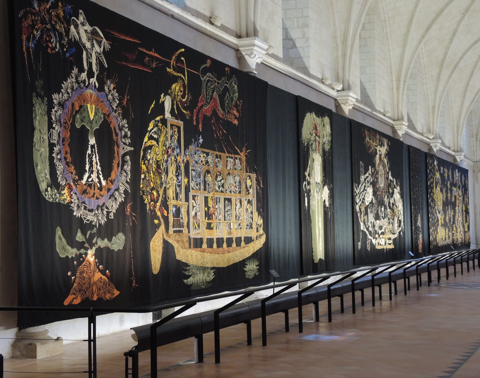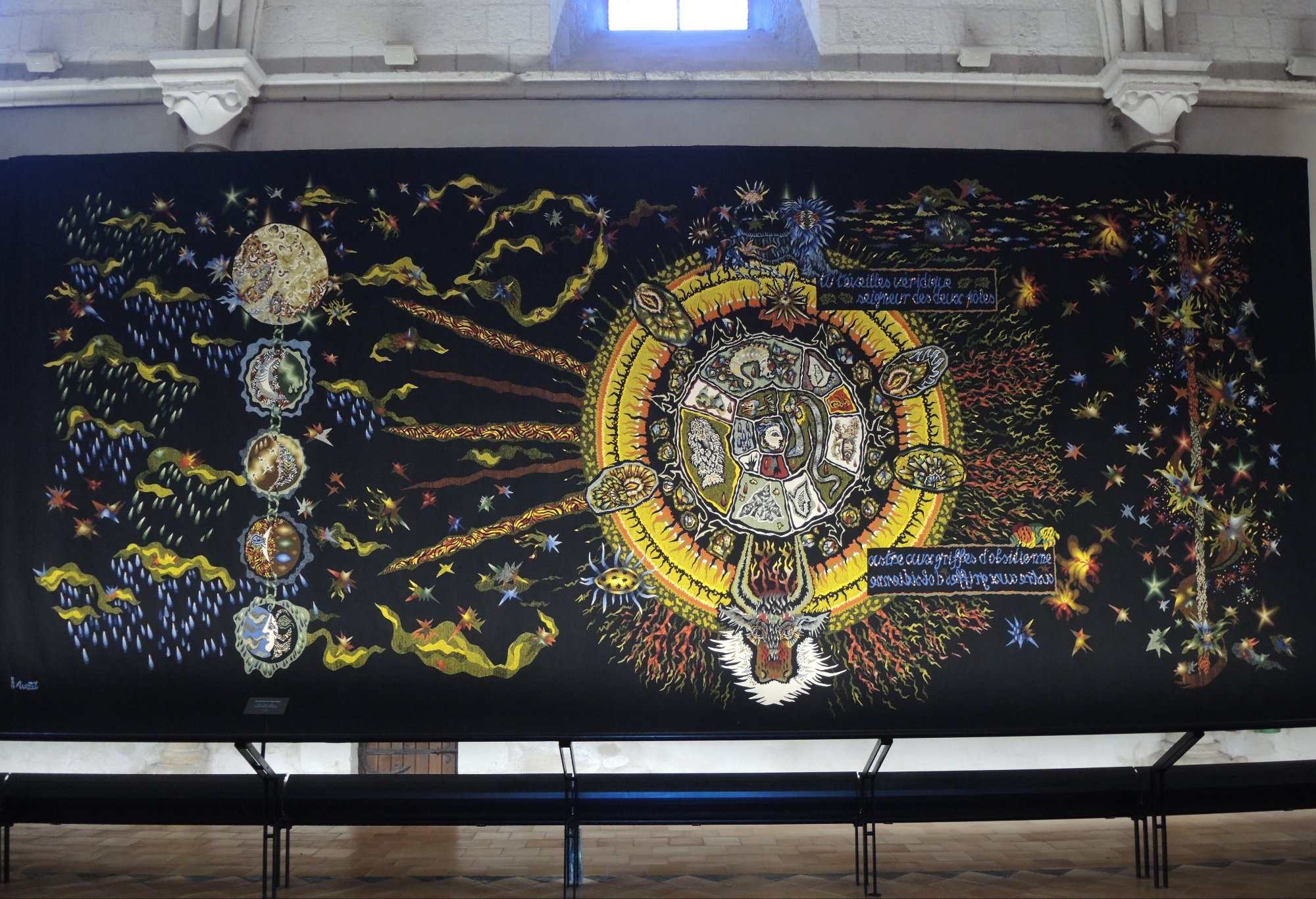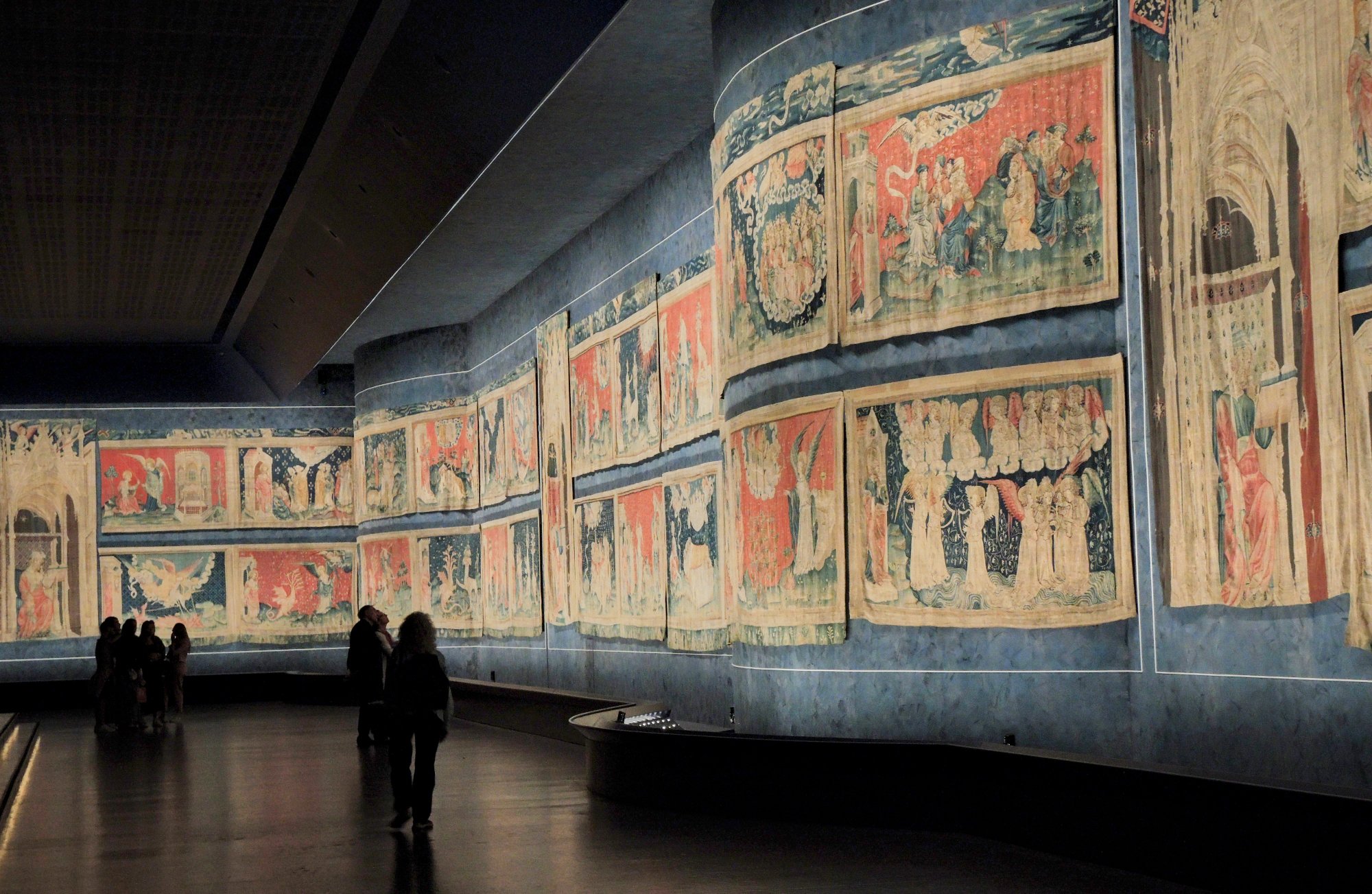 Das war schon mal imposant; der eigentliche Grund, warum wir in dieser Stadt sind, verbirgt sich hinter diesen dicken Burgmauern…….der Wandteppich der Apokalypse.Quelle: Flyer zur Besichtigung100 m lang, 6 m hoch.In der Zeit des Hundertjährigen Krieges entstanden, also 650 Jahre alt.