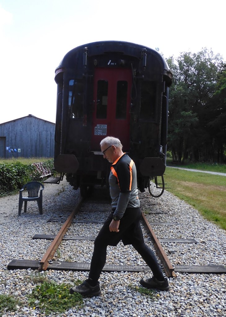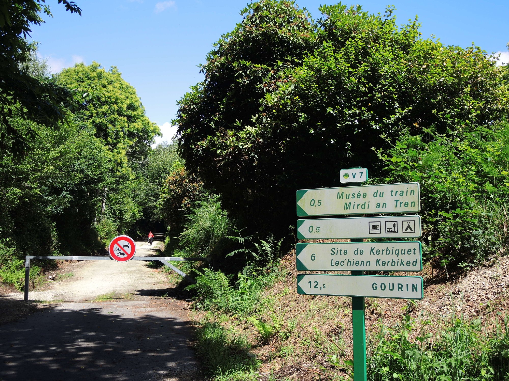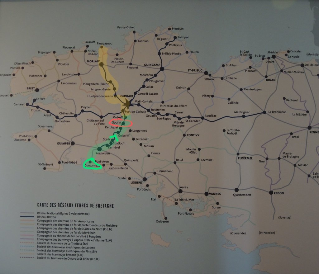 Nach zwei Tagen Regenpause sind wir heute auf einsamen Wegen unterwegs.Der Radwanderweg V7 verbindet den Atlantik mit dem Ärmelkanal. Unser heutiger Teilabschnitt führt vom Seebad Concarneau aus über die Hügel der Montagnes Noirs.Ihr werdet es bemerkt haben, es ist ein bequemer Bahnradweg. Das dazugehörige Museum ist nach 30 km ausgeschildert.Ludwig stellt fest, dass es keine Schmalspurbahn ist. Ein nette Idee. Der Tresen des Ticketschalters aus....alten Reisekoffern.Der Streckenplan, ab 1885 realisiert. Wir fahren von Süd nach Nord, vom Atlantik zum Ärmelkanal, quer durchs Land auf dieser ehemaligen Bahntrasse.Durch den Bau war das Innere der Bretagne nicht mehr isoliert.Der zweite Weltkrieg hat auch hier seine Spuren hinterlassen. 14 Züge waren für den Bau des deutschen Atlantikwalls im Einsatz.Bei dieser Darstellung wird uns bewusst, dass es früher ja mal separate Gepäckwagons gab.