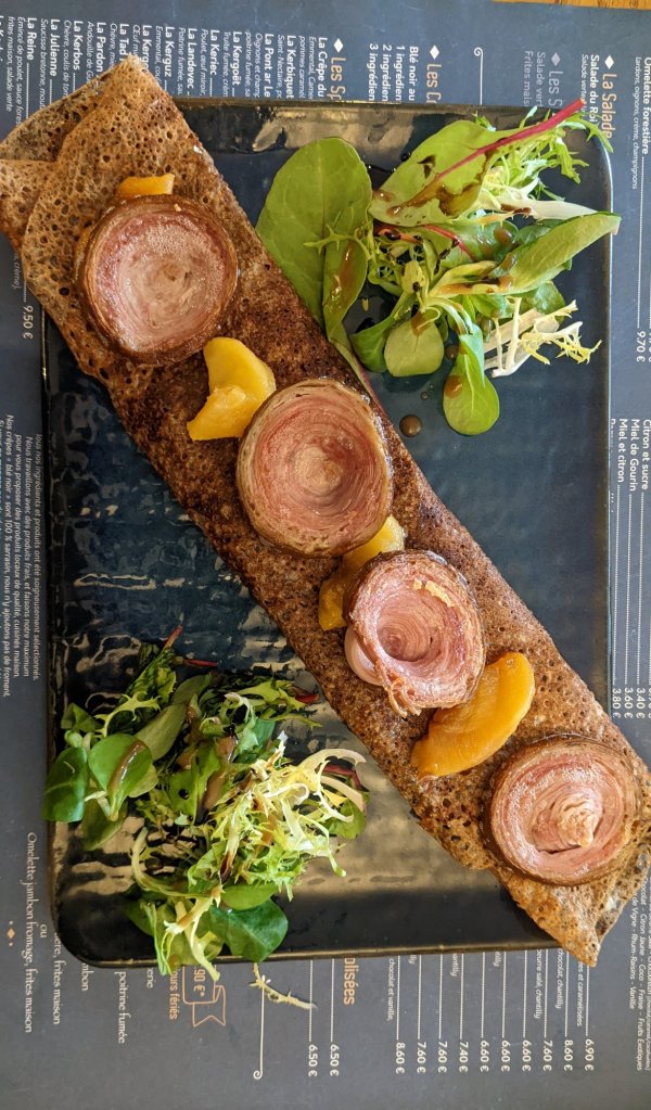 Im Bild Galette. Auflagen: Scheiben einer Fleischwurstrolle (andoville de Guémené), karamellisierter Apfel