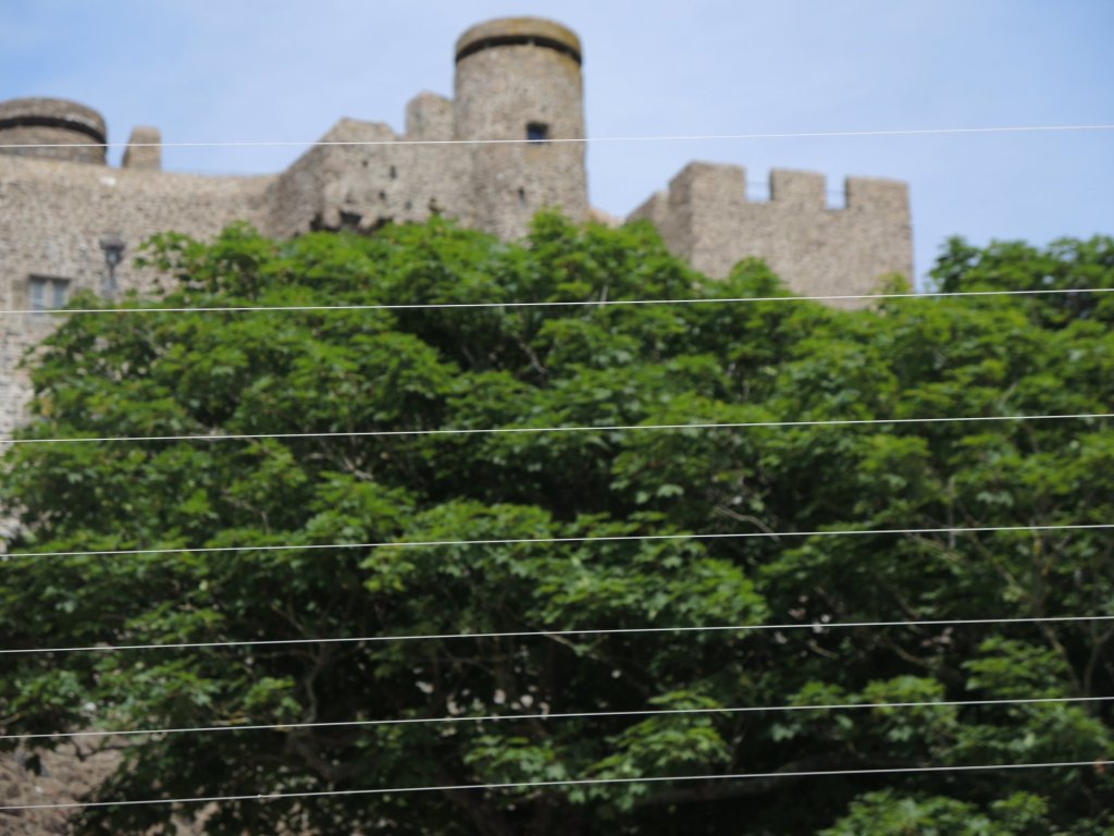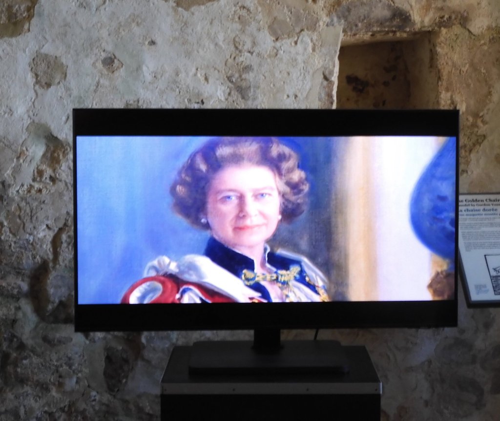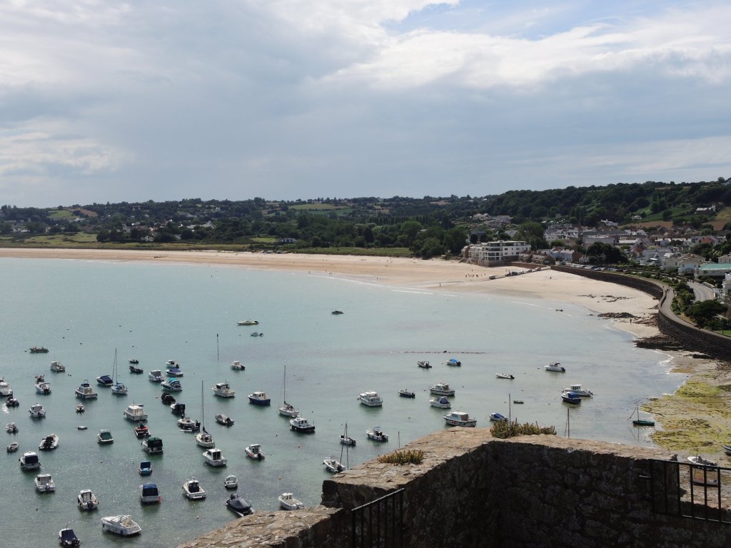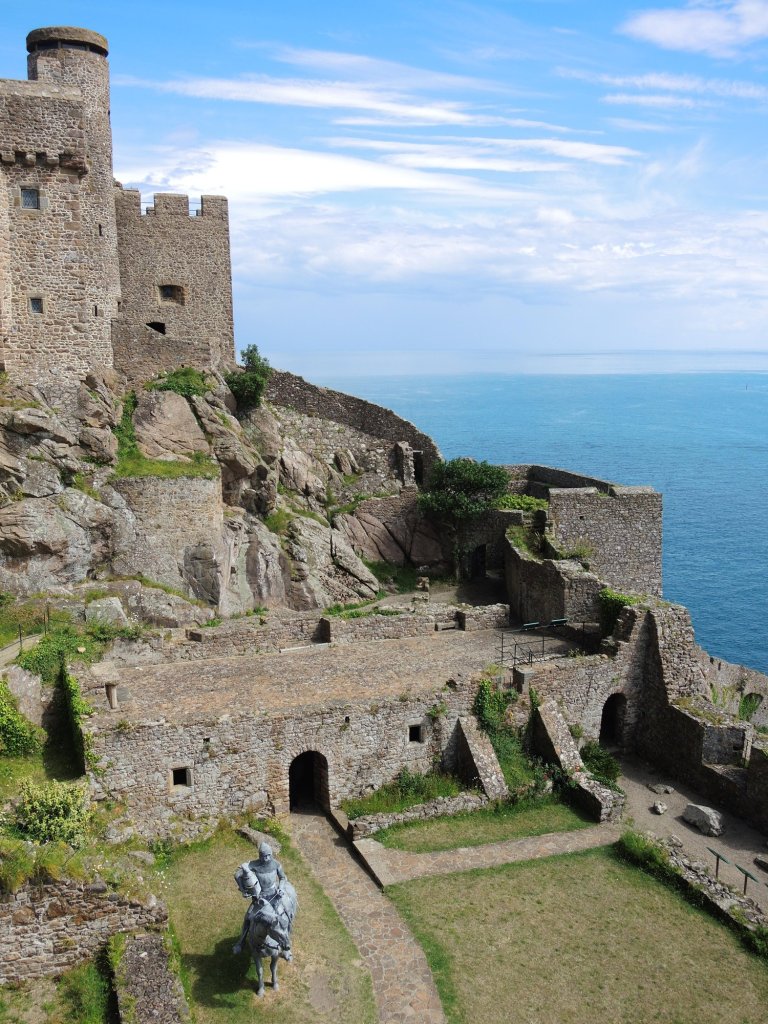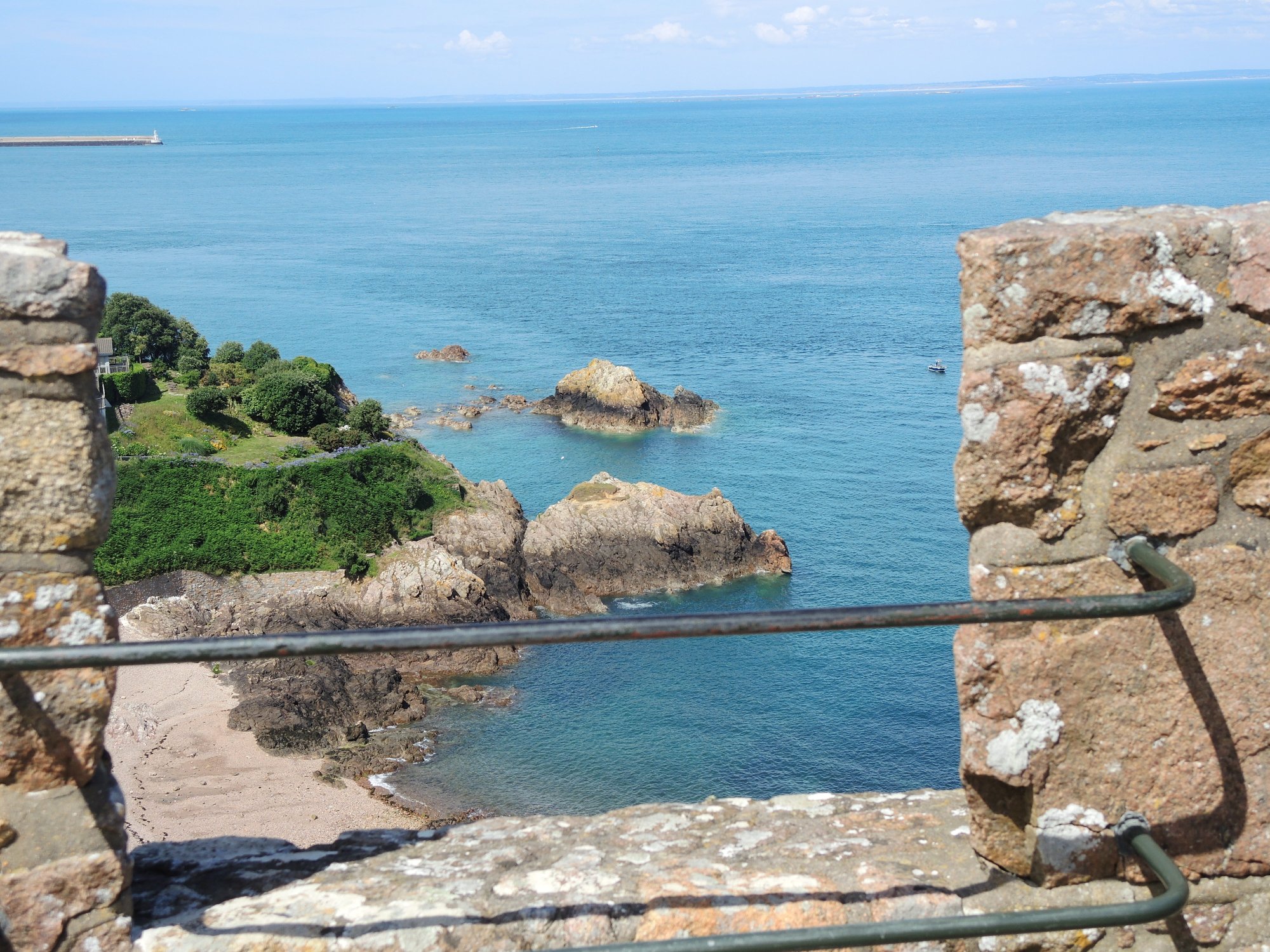 Blick auf den Hafen von Gorey und den Strand ‚Royal Bay of Grouville‘ Es gibt sogar einen kleinen Park dort oben. Blick zur französischen Küste, Normandie, und… … in Richtung St. Malo, Bretagne. Haben alle ihre Fahnen auf dem Bergfried mal gehisst: Union Jack (Vereinigtes Königreich), Cross of St.George, State of Jersey, Blau mit Lilien (französische Könige), Nazideutschland.Die Burg ist zudem Heimat zahlreicher Ausstellungen, wie zum Beispiel „The Queen“ (Die Königin) von Lichtküstler Chris Levine… … und Hologramm-Künstler Rob Murray. Von ihm wird „Equanimity“ (Gelassenheit) ausgestellt, ein weltbekanntes holografisches Porträt Ihrer Majestät, in Auftrag gegeben von Jersey zum Anlass der Feierlichkeiten zur 800-jährigen Beziehung mit der Monarchie. Das Burgcafé. Seht ihr die dünnen Leinen? Im Detail. Seitdem eine Möwe Kerstin eine Eiskugel direkt aus der in der Hand gehaltenen Waffel gestibitzt hat, wissen wir warum.