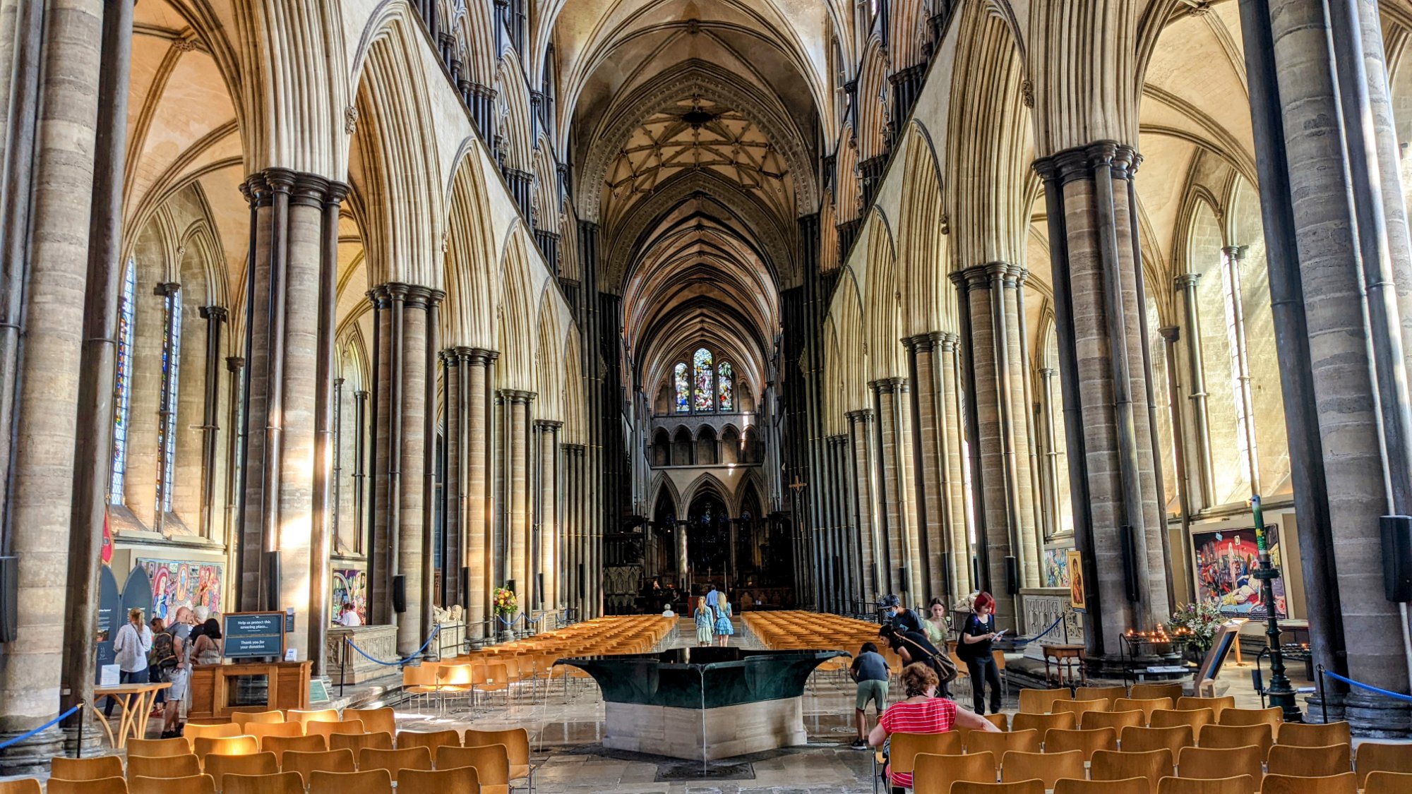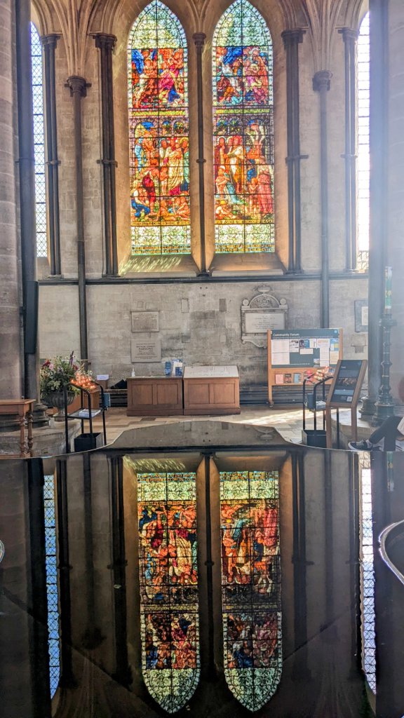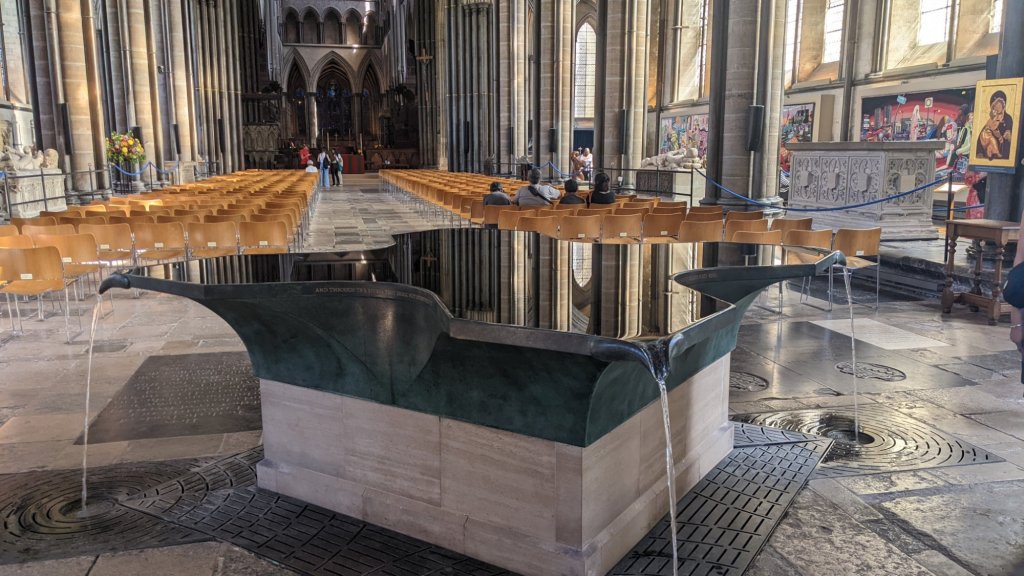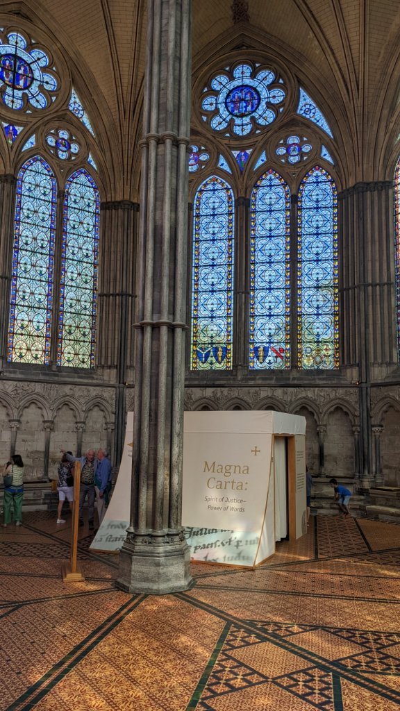 Über die Wasserspiegelung des Taufbeckens lassen sich beeindruckende Fotos arrangieren.Die älteste noch im Betrieb befindliche mechanische Uhr der Welt. 1386. Die vierte Tapesserien – Ausstellung auf unserer Reise. Wir sind jetzt Fans dieser riesigen Wandteppiche.Die einzige noch erhaltene Version der Magna – Carta bekommen wir in diesem Zelt zu sehen.Die Magna Carta (auch Magna Charta), Langform Magna Carta Libertatum (lateinisch für „große Urkunde der Freiheiten“; deutsch auch Der Große Freibrief), ist eine von König Johann Ohneland zu Runnymede in England am 15. Juni 1215 besiegelte Vereinbarung mit dem revoltierenden englischen Adel. Sie gilt als die wichtigste Quelle des englischen Verfassungsrechts…. >>>Wikipedia(Fotografieren nicht erwünscht)