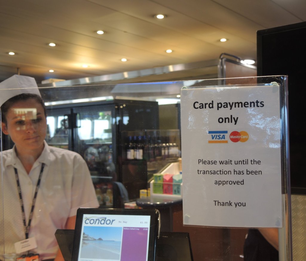 Wir wollten unser £ – Bargeld verprassen, da wir es nicht benötigt hatten. Das gestaltete sich als unmöglich. Im Hotel gestern nicht, in einem kleinen Kiosk an der Fähre, wie auch auf der Fähre selbst nicht: Nur Kartenzahlung. (Das Schild ist nicht vollständig, auch unsere Bankkarte können wir einsetzen).