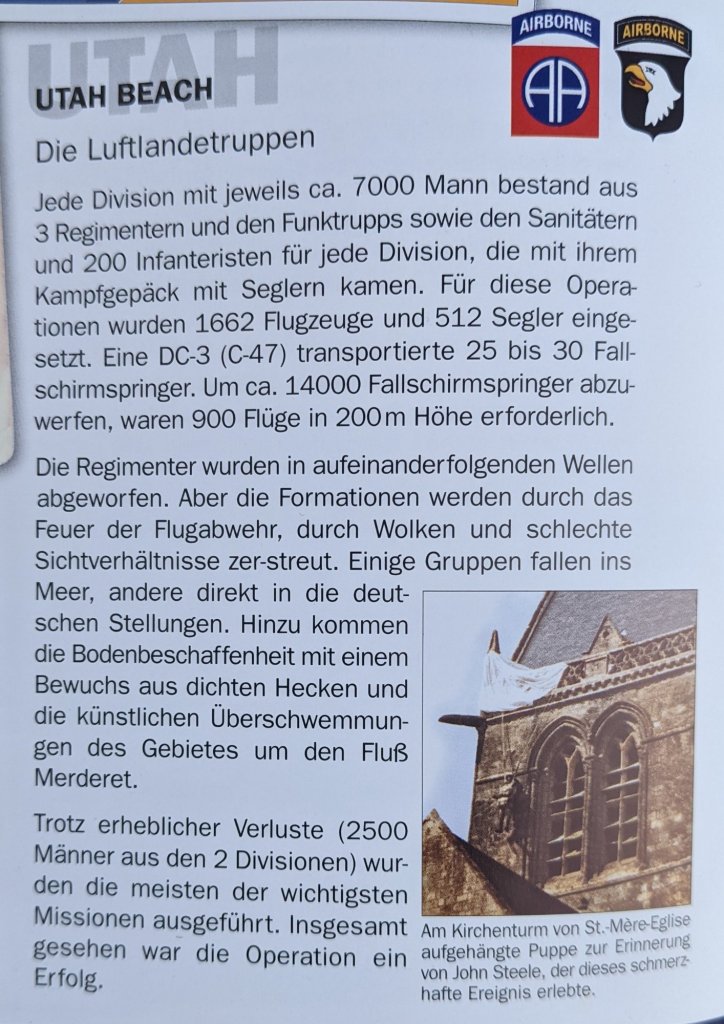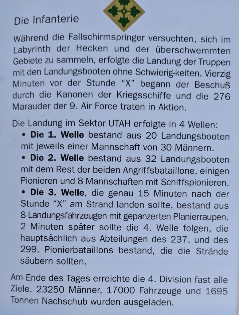 Die Amerikaner hatten hier am Ende des 6. Juni 1944 in 3 Wellen insgesamt 23.250 Männer, 17.000 Fahrzeuge und 2.695 Tonnen Nachschub angelandet.