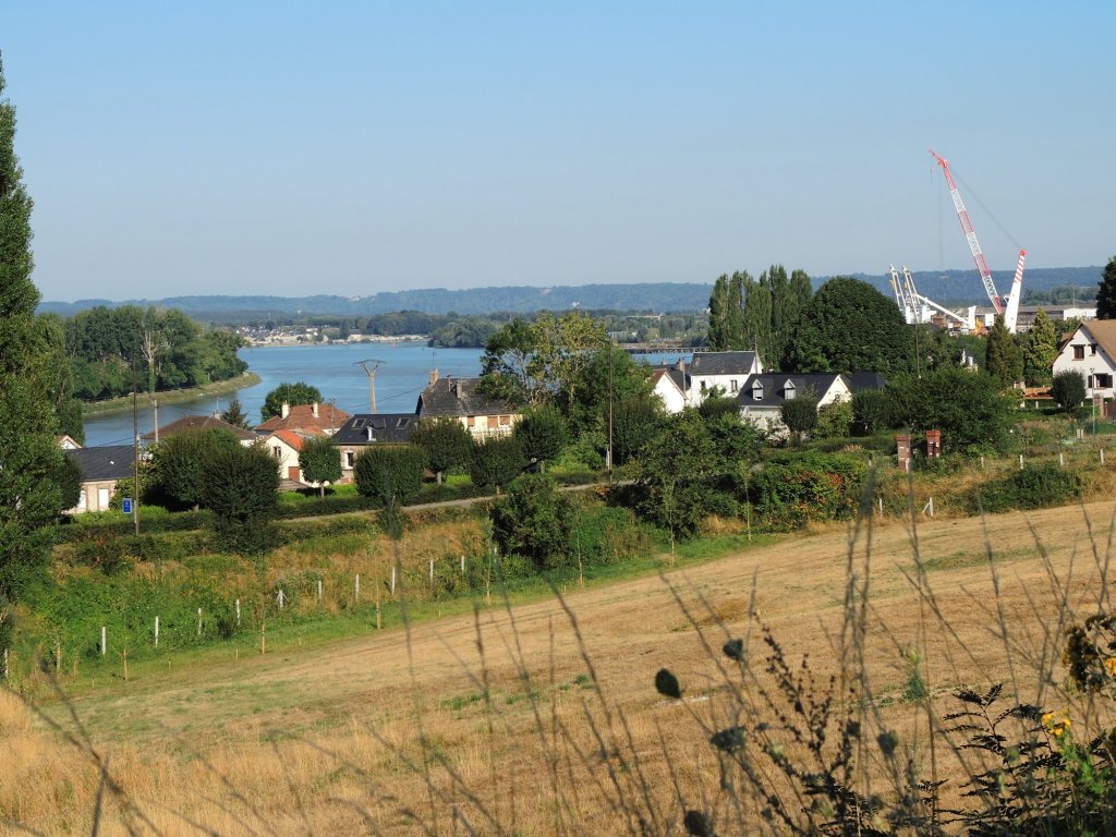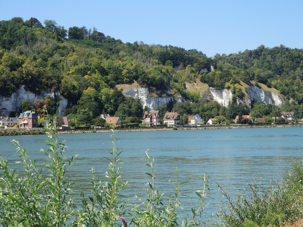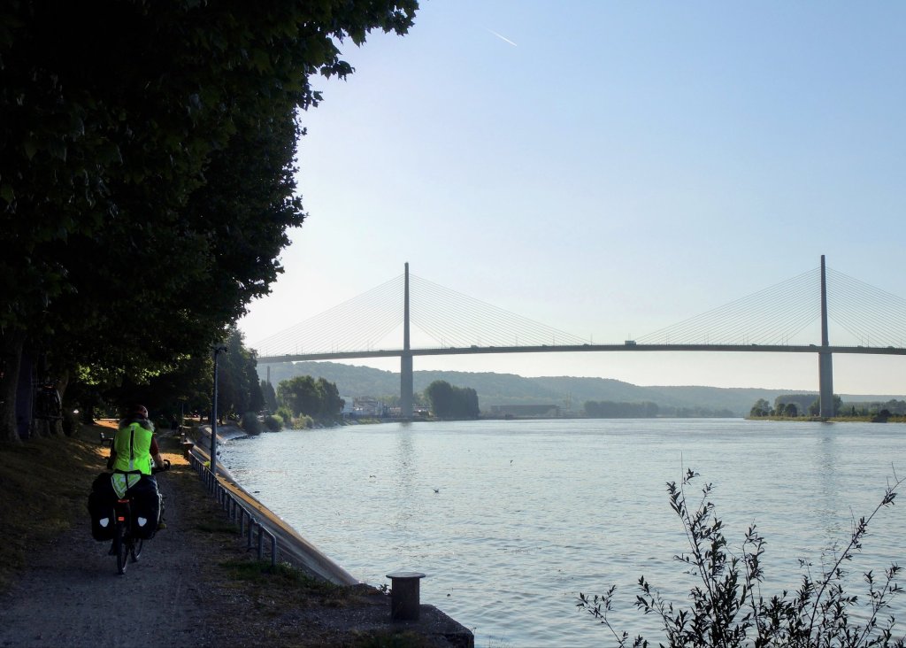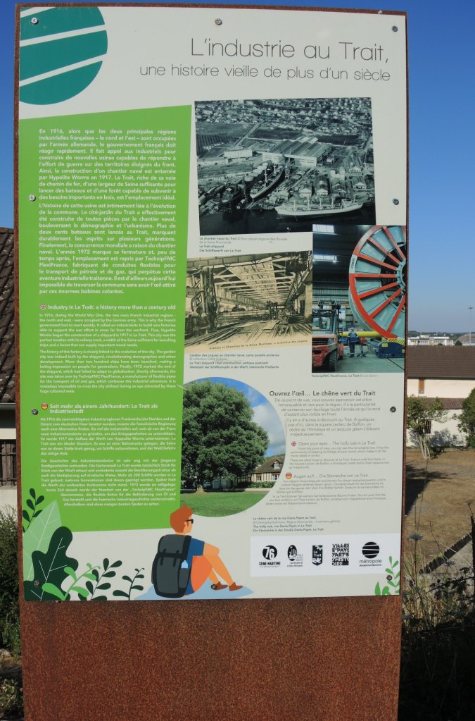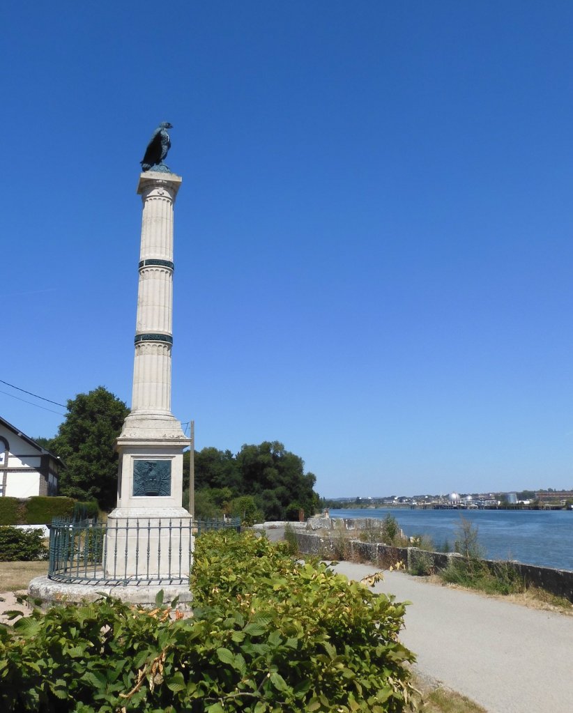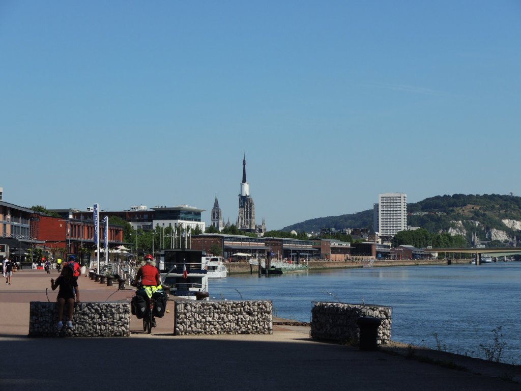 Zelt abgebaut, gefrühstückt, alles eingepackt. 08.20 Uhr, es geht los. Wir fahren der Sonne entgegen, entsprechend schwierig ist das fotografieren, Gegenlicht.Ein Bahnradweg, wie angenehm.Mit Hinweisschildern……sogar in Deutsch.Le Trait ist durch Schiffbau zu Wohlstand gekommen. Heute werden flexible Rohre für Gas-und Ölleitungen gebaut. (Mehr im Hinweisschild)Die Seine windet sich durch die Landschaft. Wir beschließen spontan, auf dem angenehmen Bahnradweg eine Schleife abzukürzen. Die gesparten 18 km investieren wir in zwei lange Pausen im Schatten.Rastplatz mit Toilette👋.Seine-Fähre Duclair.Wir sind seit Le Havre im Département Seine-Maritime. Steht am Schiff. Überfahrt kostenlos, auch für PKWs1. Pause am Fähranleger.Vertrocknete Weiden.Im Schatten der Pappeln ist es auch für die Rinder angenehmer Nicht verwechseln mit der „Jersey-Kuh“. Auch die Mutterkühe haben es sich unter Bäumen gemütlich gemacht. Fähre La Bouilie2. Pause mit Aussicht.Die sterblichen Überreste Napoleons wurde 1840 von St. Helena zurückgeholt, in Cherbourg auf ein Binnenschiff umgeladen, wegen Eisgangs bei -10° musste es hier stoppen, ……deswegen das Denkmal. Auf den Banderolen die großen Schlachten, wie Jena und Austerlitz. Völkerschlacht zu Leipzig und Waterloo fehlen!20 km fahren wir an Hafenanlagen Rouen entgegen..Der Hafen befindet sich bis zu 80 Kilometer von der Flussmündung entfernt. Gleichwohl ist er zugleich Fluss- und Seehafen. Die maximale Schiffslänge beträgt 260 Meter bei maximal etwa 150.000 Tonnen.Der größte Getreidehafen Europas.Blick aus unserem Hotelfenster. Comfort Hotel Alba, Rouen. GoogleMaps