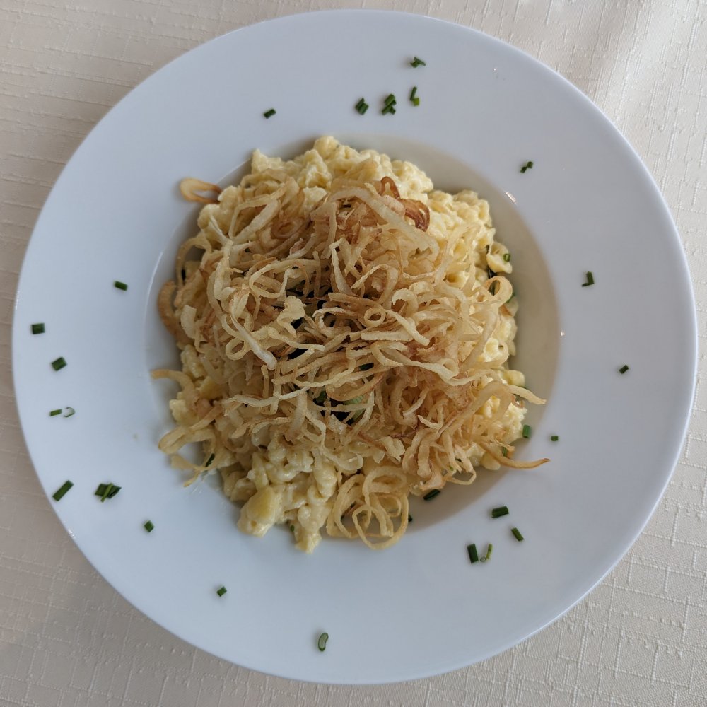 Schwäbische Käsespätzle mit Röstzwiebeln.