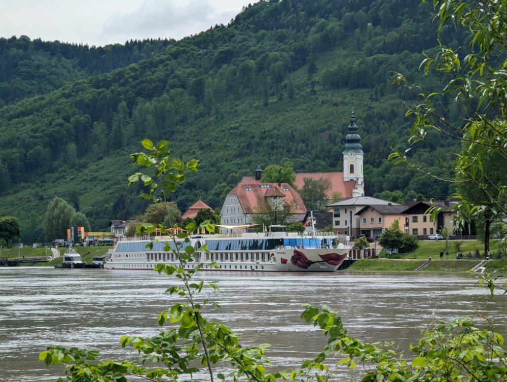 Überall  Flusskreuzfahrtschiffe. Im Bild die Arosa Mia.
