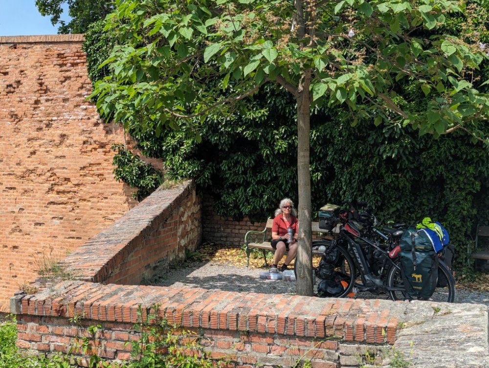 Bargeld aus dem Automaten einer Sparkasse. Nicht gesucht, Augen auf, direkt am Weg. Das nennen wir Service😉Im Schlosspark finden wir eine ……schattige Bank für unsere Mittagspause mit…